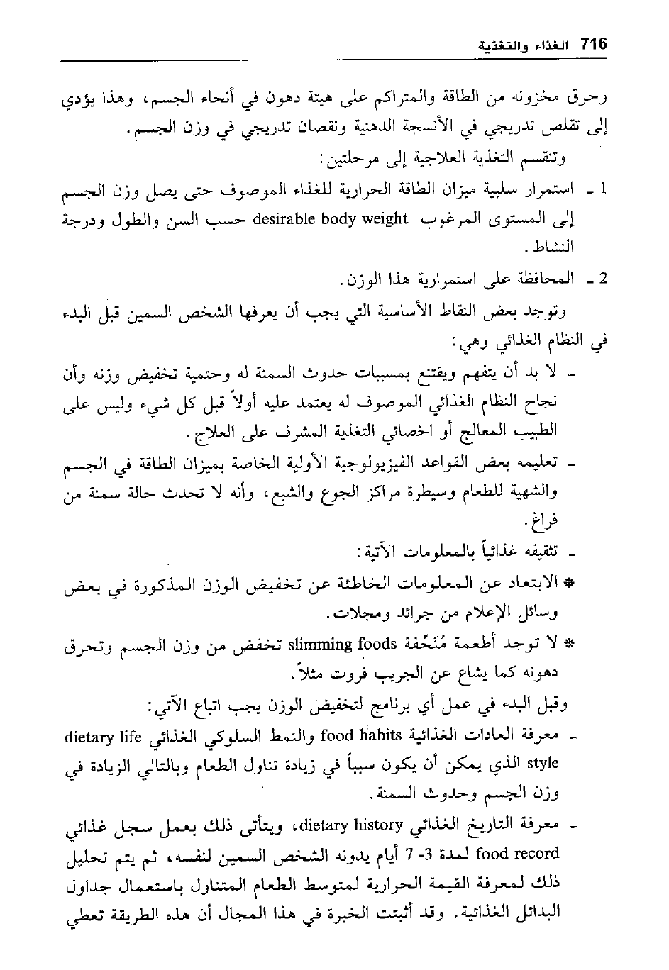 1- استمرار سلبية ميزان الطاقة الحرارية للغذاء الموصوف حتى يصل وزن الجسم إلى المستوى المرغوب desirable body weight psf حسب السن والطول ودرجة النشاط.