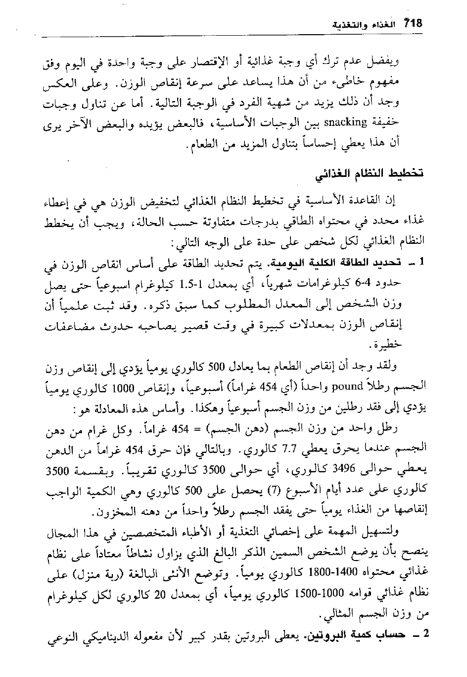 ولقد وجد أن إنقاص الطعام بما يعادل 500 كالوري يوميا يؤدي إلى إنقاص وزن الجسم رطلا pound واحدا "أي 454 غراما" أسبوعيا، وإنقاص 1000 كالوري يوميا يؤدي إلى فقد رطلين من وزن الجسم أسبوعيا وهكذا. وأساس هذه المعادلة هو: