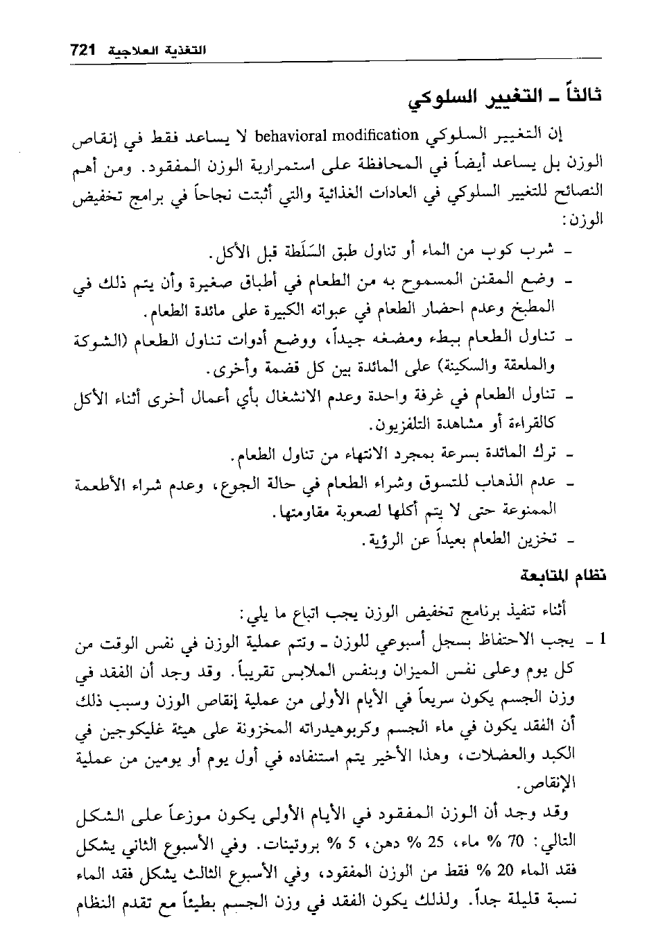 إن التغيير السلوكي bihavioral modifcation لا يساعد فقط في إنقاص الوزن بل يساعد أيضا في المحافظة على استمرارية الوزن المفقود. ومن أهم النصائح للتغيير السلوكي في العادات الغذائية والتي أثبتت نجاحا في برامج تخفيض الوزن: