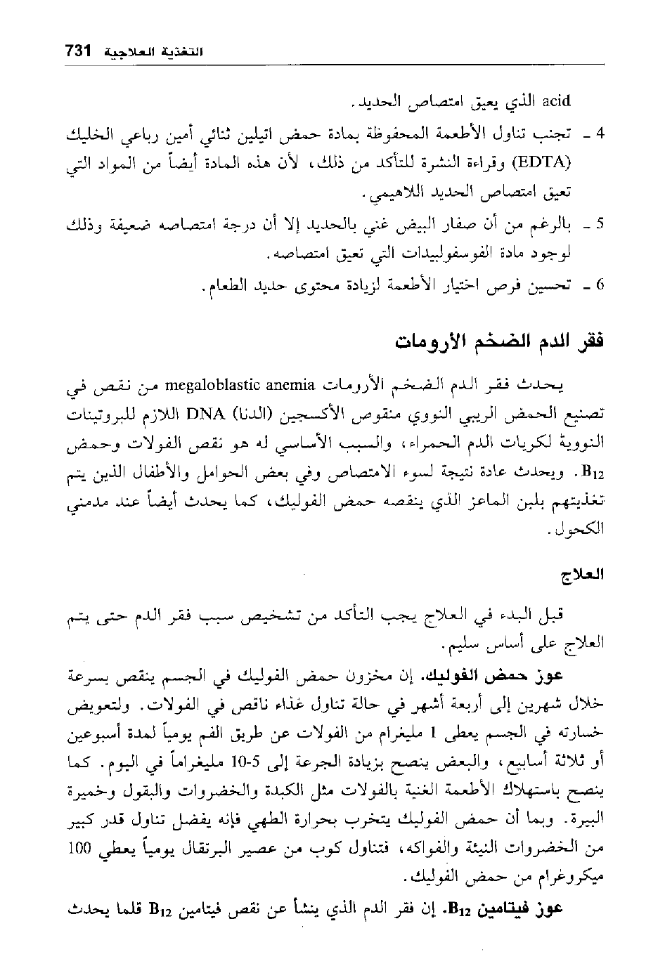 عوز حمض الفوليك. إن مخزون حمض الفوليك في الجسم ينقص بسرعة خلال شهرين إلى أربعة أشهر في حالة تناول غذاء ناقص في الفولات. ولتعويض خسارته في الجسم يعطى 1 مليغرام من الفولات عن طريق الفم يوميا لمدة أسبوعين أو ثلاثة أسابيع، والبعض ينصح بزيادة الجرعة إلى 5-10 مليغرام في اليوم. كما ينصح باستهلاك الأطعمة الغنية بالفولات مثل الكبدة والخضراوات والبقول وخميرة البيرة. وبما أن حمض الفوليك يتخرب بحرارة الطهي فإنه يفضل تناول قدر كبير من الخضراوات النيئة والفواكه، فتناول كوب من عصير البرتقال يوميا يعطي 100 ميكروغرام من حمض الفوليك.