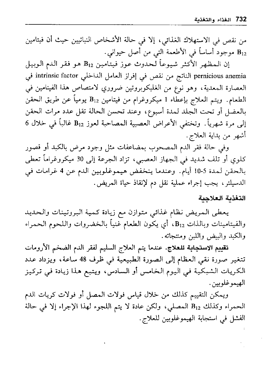 إن المظهر الأكثر شيوعا لحدوث عوز فيتامين B هو فقر الدم الوبيل pernicious anemea الناتج من نقص في إفراز العامل الداخلي intrinsic factor في العصارة المعدية، وهو نوع من الغليكوبروتين ضروري لامتصاص هذا الفيتامين في الطعام. ويتم العلاج بإعطاء 1 ميكروغرام من فيتامين B يوميا عن طريق الحقن بالعضل أو تحت الجلد لمدة أسبوع، وعند تحسن الحالة تقل عدد مرات الحقن إلى مرة شهريا. وتختفي الأعراض العصبية المصاحبة لعوز 12B غالبا في خلال 6 أشهر من بداية العلاج.
