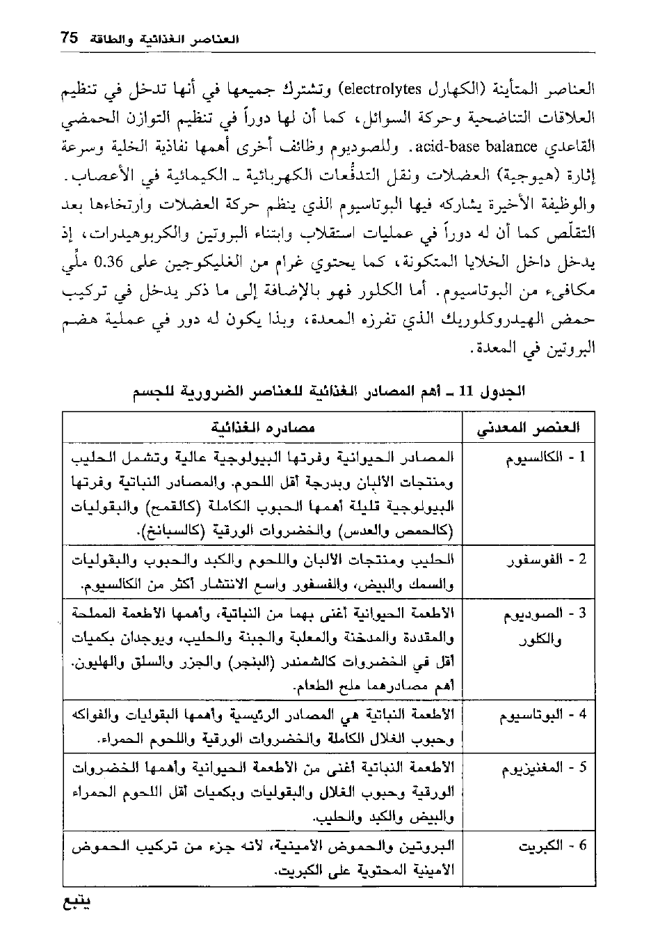 الجدول 11- أهم المصادر الغذائية للعناصر الضرورية للجسم