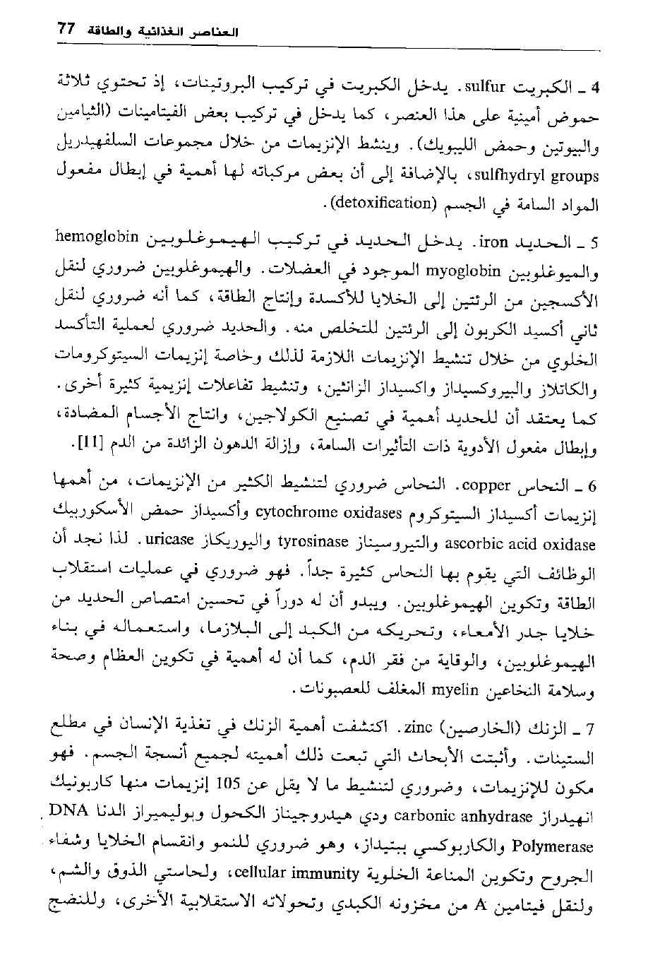 7- الزنك "الخارصين" zinc. اكتشفت أهمية الزنك في تغذية الإنسان في مطلع الستينات. وأثبتت الأبحاث التي تبعت ذلك أهميته لجميع أنسجة الجسم. فهو مكون للإنزيمات، وضروري لتنشيط ما لا يقل عن 105 إنزيمات منها كاربونيك انهيدراز carbonic anhydrase ودي هيدروجيناز الكحول وبوليميراز الدنا DNA polymerase والكاربوكسي ببتيداز، وهو ضروري للنمو وانقسام الخلايا وشفاء الجروح وتكوين المناعة الخلوية cellular immunity، ولحاستي الذوق والشم، ولنقل فيتامين A من مخزونه الكبدي وتحولاته الاستقلابية الأخرى، وللنضج