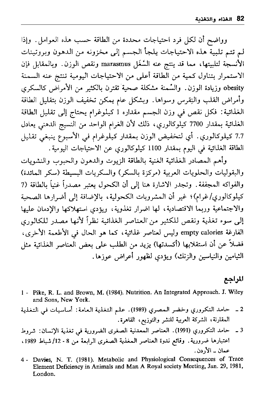وواضح أن لكل فرد احتياجات محدودة من الطاقة حسب هذه العوامل. وإذا لم تتم تلبية هذه الاحتياجات يلجأ الجسم إلى مخزونه من الدهون وبروتينات الأنسجة لتلبيتها، مما قد ينتج عنه السغل marasmus ونقص الوزن. وبالمقابل فإن الاستمرار بتناول كمية من الطاقة أعلى من الاحتياجات اليومية تنتج عنه السمنة obesity وزيادة الوزن. والسمنة مشكلة صحية تقترن بالكثير من الأمراض كالسكري وأمراض القلب والنقرس وسواها. وبشكل عام يمكن تخفيف الوزن بتقليل الطاقة الغذائية: فكل نقص في وزن الجسم مقداره 1 كيلو غرام يحتاج إلى تقليل الطاقة الغذائية بمقدار 7700 كيلو كالوري، ذلك لأن الغرام الواحد من النسيج الدهني يعادل 7.7 كيلو كالوري. أي لتخفيض الوزن بمقدار كيلو غرام في الأسبوع ينبغي تقليل الطاقة الغذائية في اليوم بمقدار 1100 كيلو كالوري عن الاحتياجات اليومية.