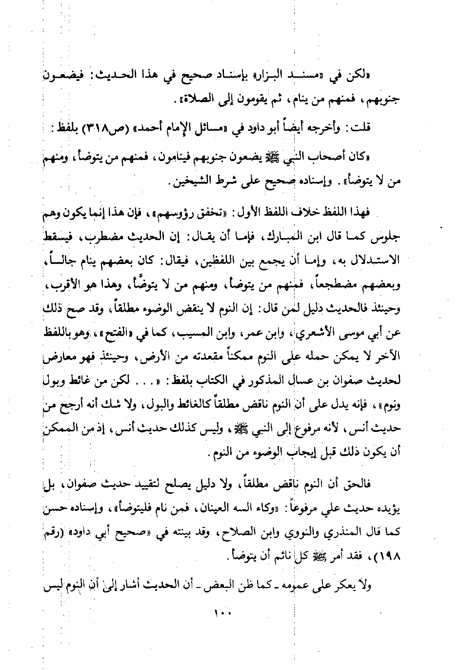 فالحق أن النوم ناقض مطلقا ولا دليل يصلح لتقييد حديث صفوان بل يؤيده حديث علي مرفوعا: "وكاء السه العينان فمن نام فليتوضأ" وإسناده حسن كما قال المنذري والنووي وابن الصلاح وقد بينته في "صحيح أبي داود" رقم 198 فقد أمر صلى الله عليه وسلم كل نائم أن يتوضأ.