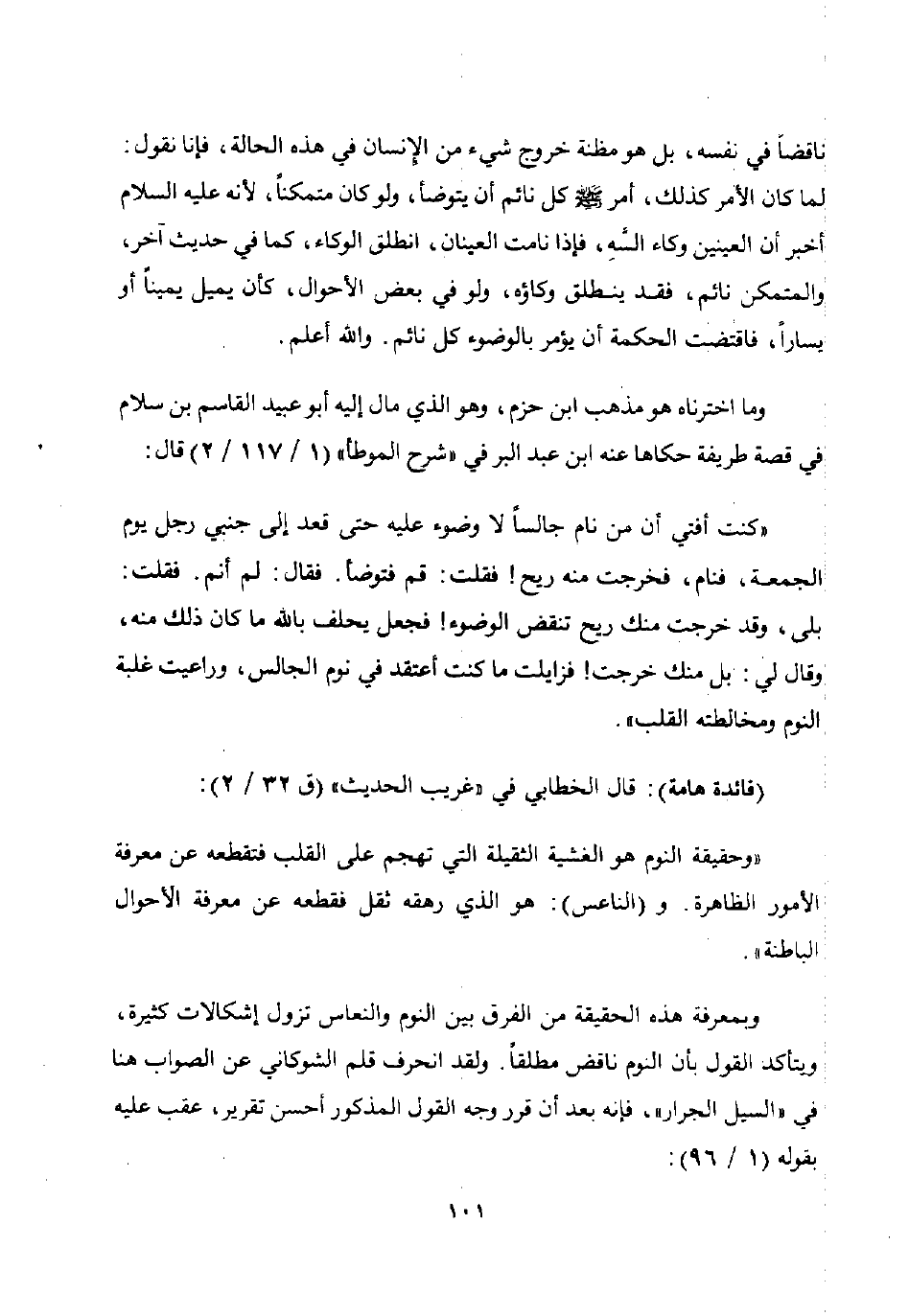 وبمعرفة هذه الحقيقة من الفرق بين النوم والنعاس تزول إشكالات كثيرة ويتأكد القول بأن النوم ناقض مطلقا. ولقد أنحرف قلم الشوكاني عن الصواب هنا في "السيل الجرار" فإنه بعد أن قرر وجه القول المذكور أحسن تقرير عقب عليه بقوله 1 / 96: