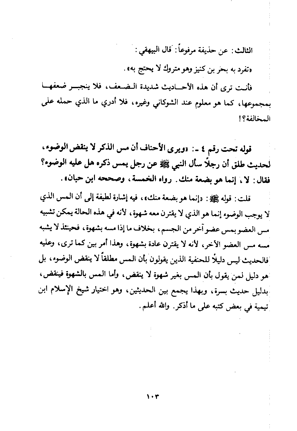 قوله تحت رقم 4 -: ويرى الأحناف أن مس الذكر لا ينقض الوضوء لحديث طلق أن رجلا سأل النبي صلى الله عليه وسلم عن رجل يمس ذكره هل عليه الوضوء؟ فقال: "لا إنما هو بضعة منك" رواه الخمسة وصححه ابن حبان.