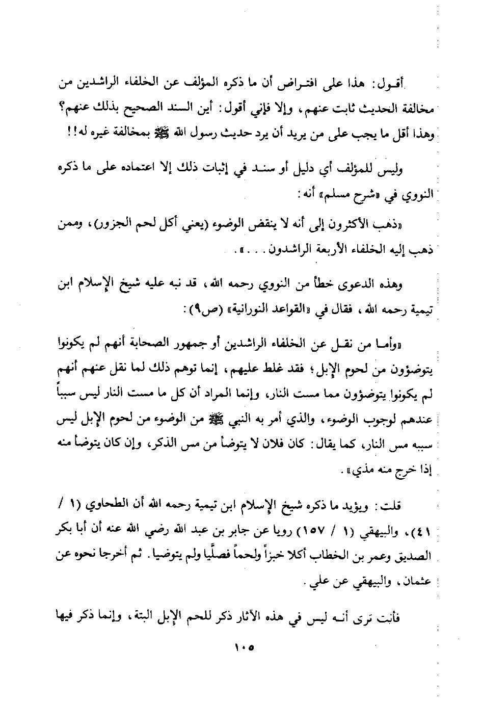 "وأما من نقل عن الخلفاء الراشدين أو جمهور الصحابة أنهم لم يكونوا يتوضؤون من لحوم الإبل فقد غلط عليهم إنما توهم ذلك لما نقل عنهم أنهم لم يكونوا يتوضؤون مما مست النار وإنما المراد أن كل ما مست النار ليس سببا عندهم لوجوب الوضوء والذي أمر به النبي صلى الله عليه وسلم من الوضؤ من لحوم الإبل ليس سببه مس النار كما يقال: كان فلان لا يتوضأ من مس الذكر وإن كان يتوضأ منه إذا خرج منه مذي".