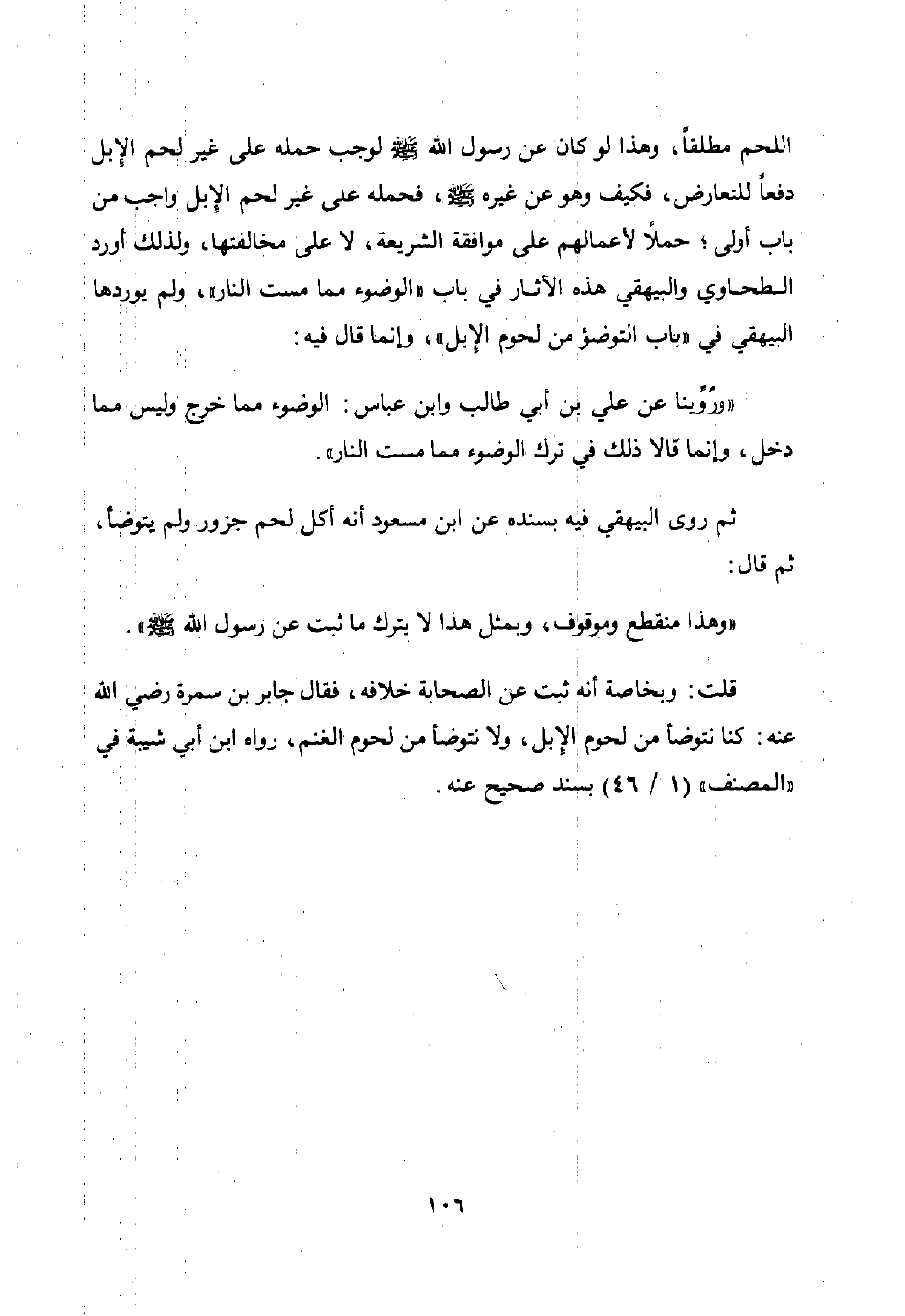 قلت: وبخاصة أنه ثبت عن الصحابة خلافه فقال جابر بن سمرة رضي الله عنه: كنا نتوضأ من لحوم الإبل ولا نتوضأ من لحوم الغنم رواه ابن أبي شيبة في "المصنف" 1 / 46 بسند صحيح عنه