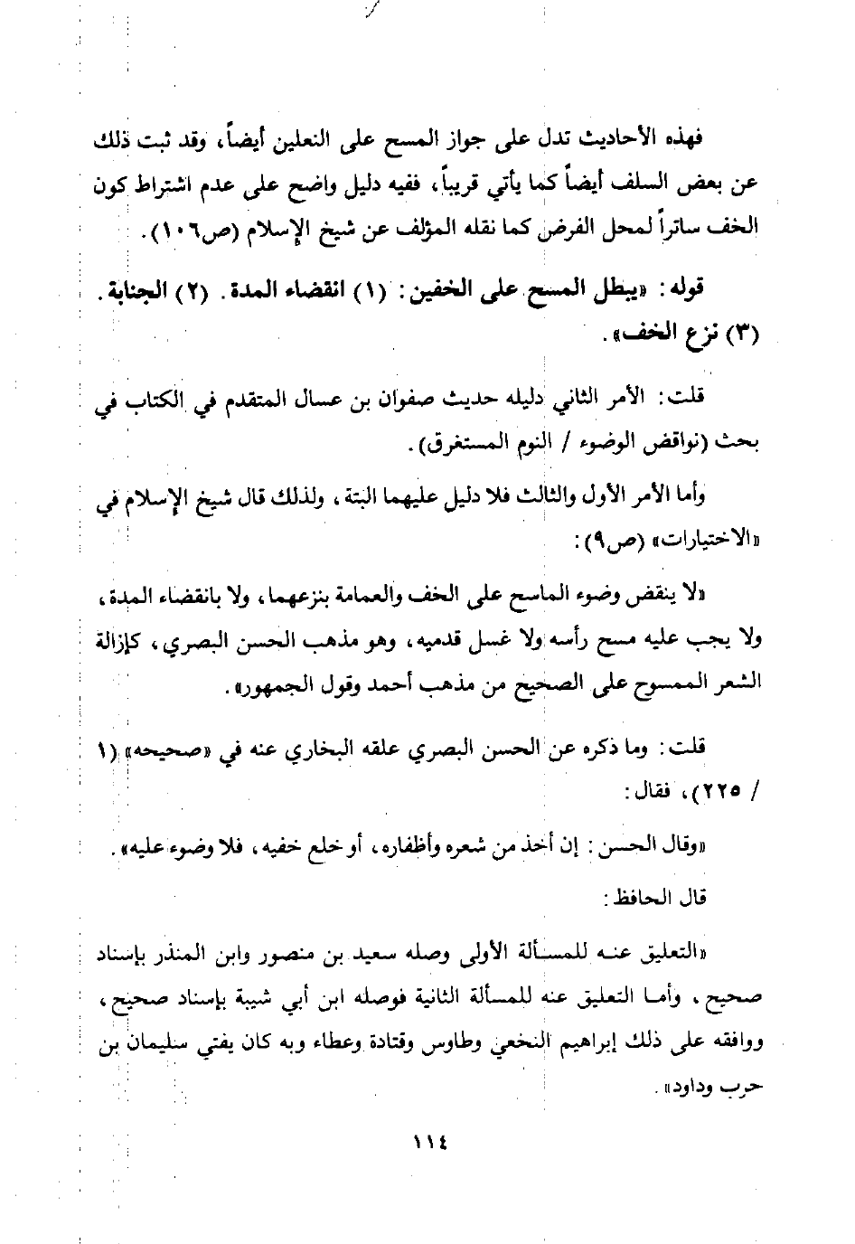 فهذه الأحاديث تدل على جواز المسح على النعلين أيضا وقد ثبت ذلك عن بعض السلف أيضا كما يأتي قريبا ففيه دليل واضح على عدم اشتراط كون الخف ساترا لمحل الفرض كما نقله المؤلف عن شيخ الإسلام ص 106.