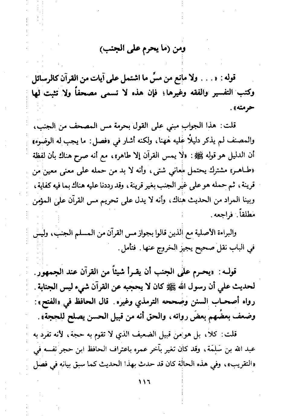 قلت: هذا الجواب مبني على القول بحرمة مس المصحف من الجنب والمصنف لم يذكر دليلا عليه ههنا ولكنه أشار في "فصل: ما يجب له الوضوء" أن الدليل هو قوله صلى الله عليه وسلم: "لا يمس القرآن إلا طاهر" مع أنه صرح هناك بأن لفظة "طاهر" مشترك يحتمل معاني شتى وأنه لا بد من حمله على معنى معين من قرينة ثم حمله هو على غير الجنب بغير قرينة وقد رددنا عليه هناك بما فيه كفاية وبينا المراد من الحديث هناك وأنه لا يدل على تحريم مس القرآن على المؤمن مطلقا. فراجعه.