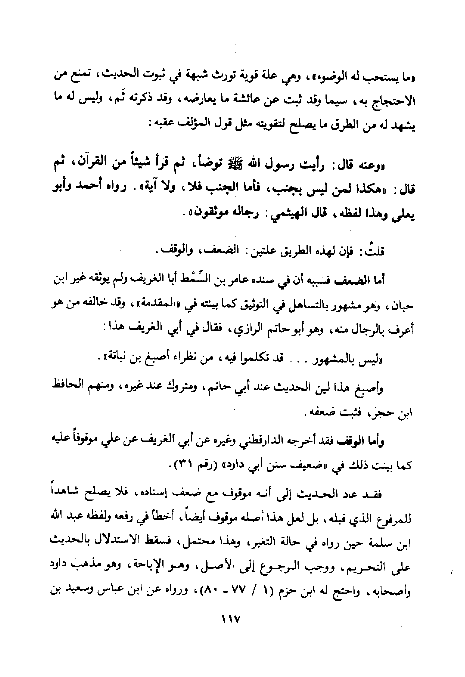 "وعنه قال: رأيت رسول الله صلى الله عليه وسلم توضأ ثم قرأ شيئا من القرآن ثم قال: "هكذا لمن ليس بجنب فأما الجنب فلا ولا آية".رواه أحمد وأبو يعلى وهذا لفظه قال الهيثمي: رجاله موثقون".