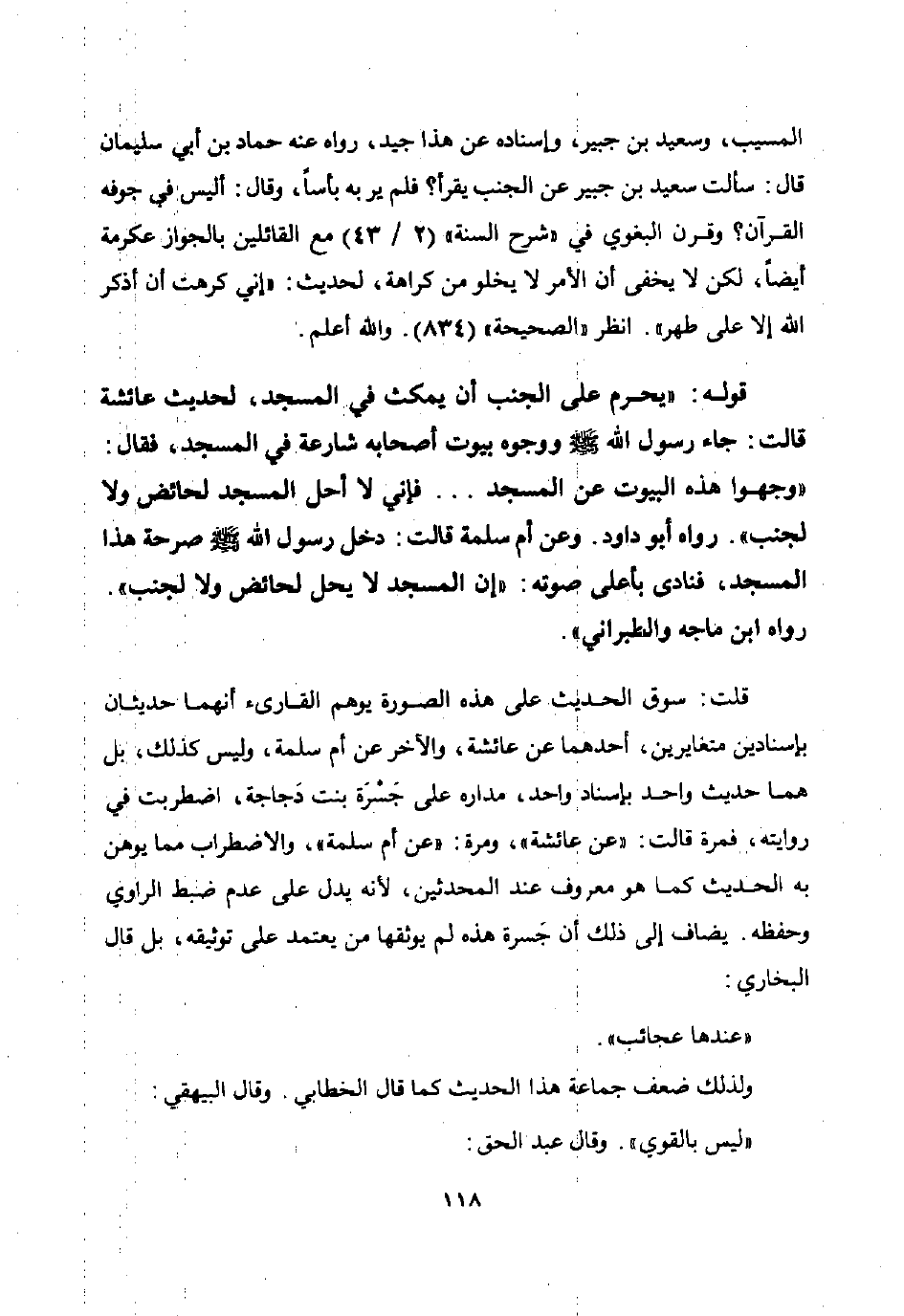 قوله: "يحرم على الجنب أن يمكث في المسجد لحديث عائشة قالت: جاء رسول الله صلى الله عليه وسلم ووجوه بيوت أصحابه شارعة في المسجد فقال: "وجهوا هذه البيوت عن المسجد ... فإني لا أحل المسجد لحائض ولا لجنب". رواه أبو داود. وعن أم سلمة قالت: دخل رسول الله صلى الله عليه وسلم صرحة هذا المسجد فنادى بأعلى صوته: "إن المسجد لا يحل لحائض ولا لجنب". رواه ابن ماجه والطبراني".