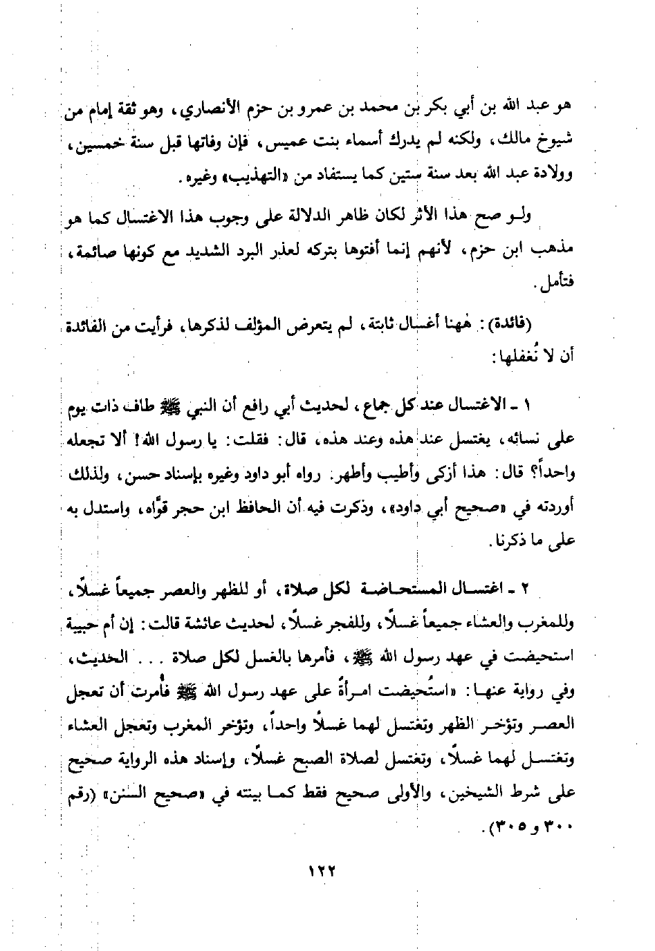 2 - اغتسال المستحاضة لكل صلاة أو للظهر والعصر جميعا غسلا وللمغرب والعشاء جميعا غسلا وللفجر غسلا لحديث عائشة قالت: إن أم حبيبة استحيضت في عهد رسول الله صلى الله عليه وسلم فأمرها بالغسل لكل صلاة ... الحديث وفي رواية عنها: استحيضت امرأة على عهد رسول الله صلى الله عليه وسلم فأمرت أن تعجل العصر وتؤخر الظهر وتغتسل لهما غسلا واحدا وتؤخر المغرب وتعجل العشاء وتغتسل لهما غسلا وتغتسل لصلاة الصبح غسلا وإسناد هذه الرواية صحيح على شرط الشيخين والأولى صحيح فقط كما بينته في "صحيح السنن" رقم 300 و305.
