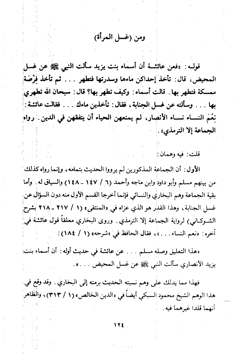 الأول: أن جماعة المذكورين لم يرووا الحديث بتمامه وإنما رواه كذلك من بينهم مسلم وأبو داود وابن ماجه وأحمد 6 / 147 - 148 والسياق له. وأما بقية الجماعة وهم البخاري والنسائي فإنما أخرجا القسم الأول منه دون السؤال عن غسل الجنابة وهذا القدر هو الذي عزاه في "المنتقى" 1 / 217 - 218 بشرح الشوكاني لرواية الجماعة إلا الترمذي. وروى البخاري معلقا قول عائشة في آخره: "نعم النساء ... " فقال الحافظ في "شرحه" 1 / 84 ا: