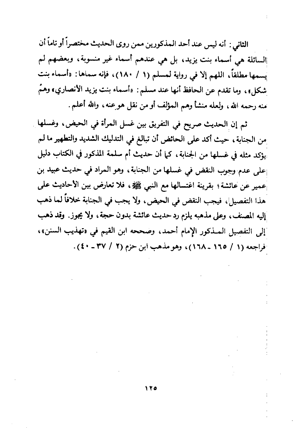 الثاني: أنه ليس عند أحد المذكورين ممن روى الحديث مختصرا أو تاما أن السائلة هي أسماء بنت يزيد بل هي عندهم أسماء غير منسوبة وبعضهم لم يسمها مطلقا اللهم إلا في رواية لمسلم 1 / 180 فإنه سماها: "أسماء بنت شكل" وما تقدم عن الحافظ أنها عند مسلم: "أسماء بنت يزيد الأنصاري" وهم منه رحمه الله ولعله منشأ وهم المؤلف أو من نقل هو عنه والله أعلم.