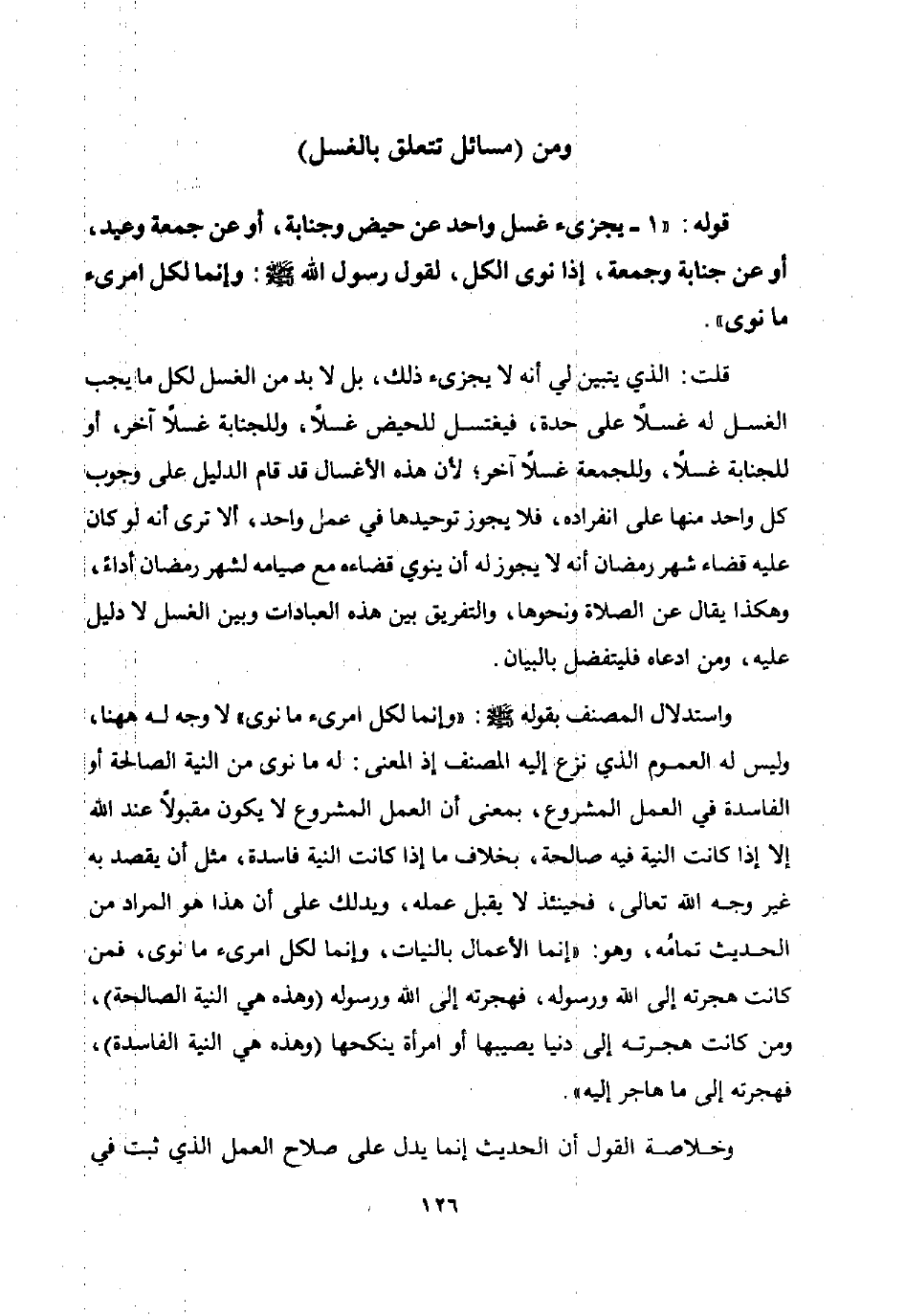 قوله: "1 - يجزئ غسل واحد عن حيض وجنابة أو عن جمعة وعيد أو عن جنابة وجمعة إذا نوى الكل لقول رسول الله صلى الله عليه وسلم: "وإنما لكل امرئ ما نوى" ".