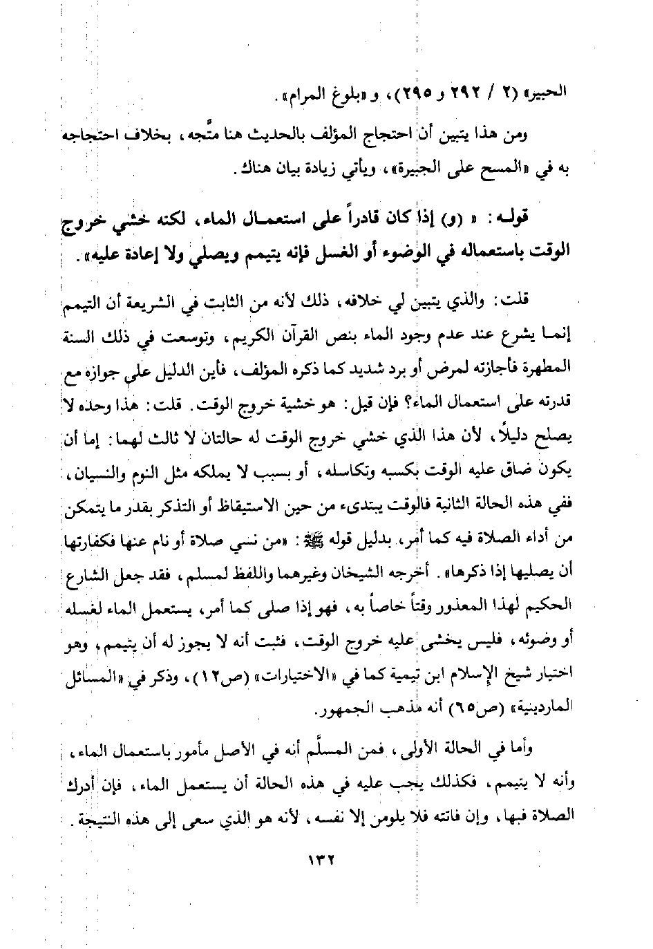 قلت: والذي يتبين لي خلافه ذلك لأنه من الثابت في الشريعة أن التيمم إنما يشرع عند عدم وجود الماء بنص القرآن الكريم وتوسعت في ذلك السنة المطهرة فأجازته لمرض أو برد شديد كما ذكره المؤلف فأين الدليل على جوازه مع قدرته على استعمال الماء؟ فإن قيل: هو خشية خروج الوقت. قلت: هذا وحده لا يصلح دليلا لأن هذا الذي خشي خروج الوقت له حالتان لا ثالث لهما: إما أن يكون ضاق عليه الوقت بكسبه وتكاسله أو بسبب لا يملكه مثل النوم والنسيان ففي هذه الحالة الثانية فالوقت يبتدئ من حين الاستيقاظ أو التذكر بقدر ما يتمكن من أداء الصلاة فيه كما أمر بدليل قوله صلى الله عليه وسلم في: "من نسي صلاة أو نام عنها فكفارتها أن يصليها إذا ذكرها". أخرجه الشيخان وغيرهما واللفظ لمسلم فقد جعل الشارع الحكيم لهذا المعذور وقتا خاصا به فهو إذا صلى كما أمر يستعمل الماء لغسله أو وضوئه فليس يخشى عليه خروج الوقت فثبت أنه لا يجوز له أن يتيمم وهو اختيار شيخ الإسلام ابن تيمية كما في "الاختيارات" ص 12 وذكر في "المسائل الماردينية" ص 65 أنه مذهب الجمهور.