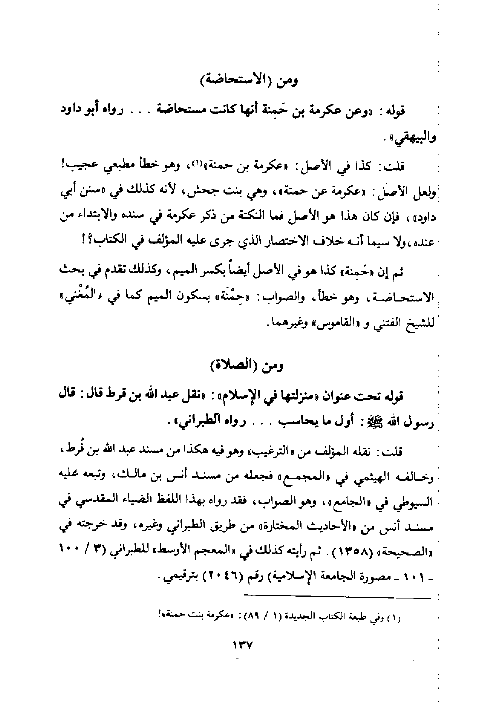قوله تحت عنوان "منزلتها في الإسلام ": "نقل عبد الله بن قرط قال: قال رسول الله صلى الله عليه وسلم: "أول ما يحاسب ... " رواه الطبراني".