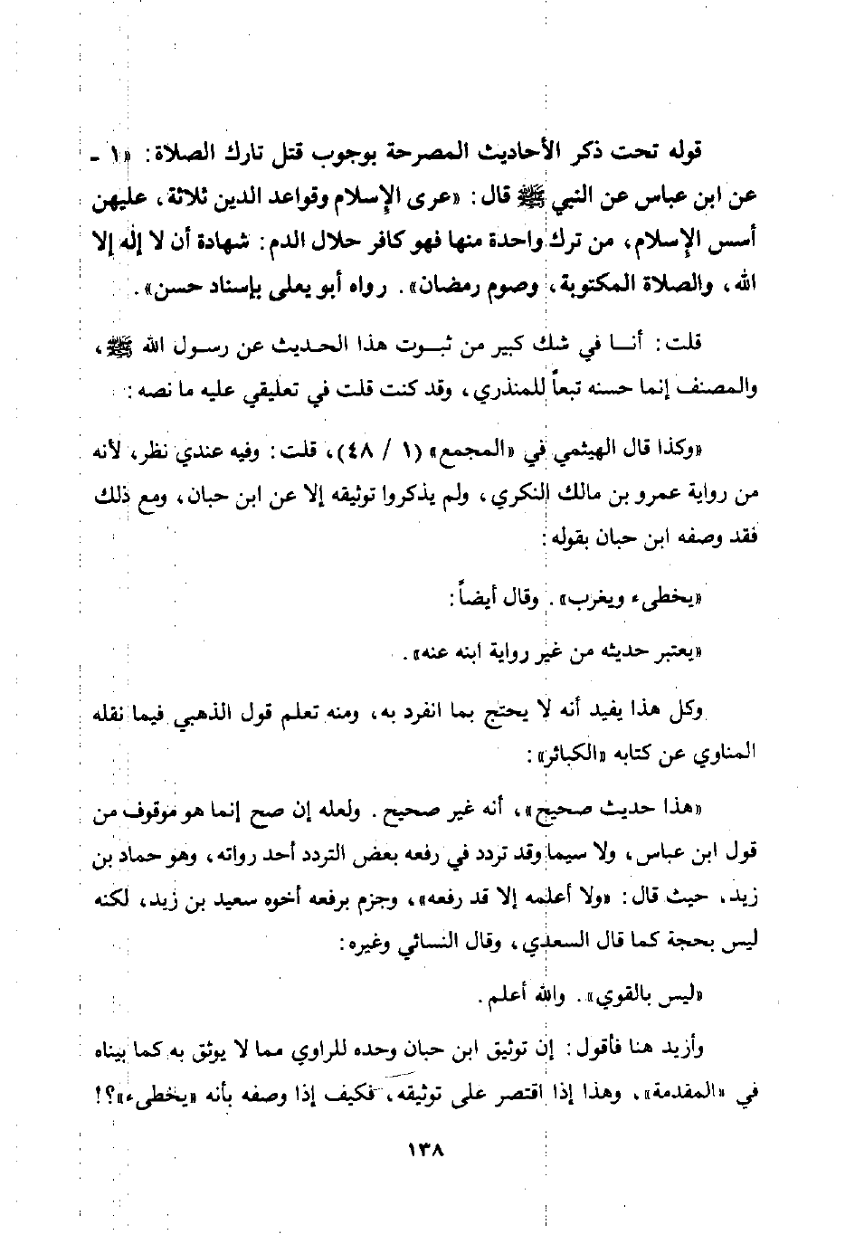 قوله تحت ذكر الأحاديث المصرحة بوجوب قتل تارك الصلاة: "1 - عن ابن عباس عن النبي صلى الله عليه وسلم قال: "عرى الإسلام وقواعد الدين ثلاثة عليهن أسس الإسلام من ترك واحدة منها فهو كافر حلال الدم: شهادة أن لا إله إلا الله والصلاة المكتوبة وصوم رمضان" رواه أبو يعلى بإسناد حسن".