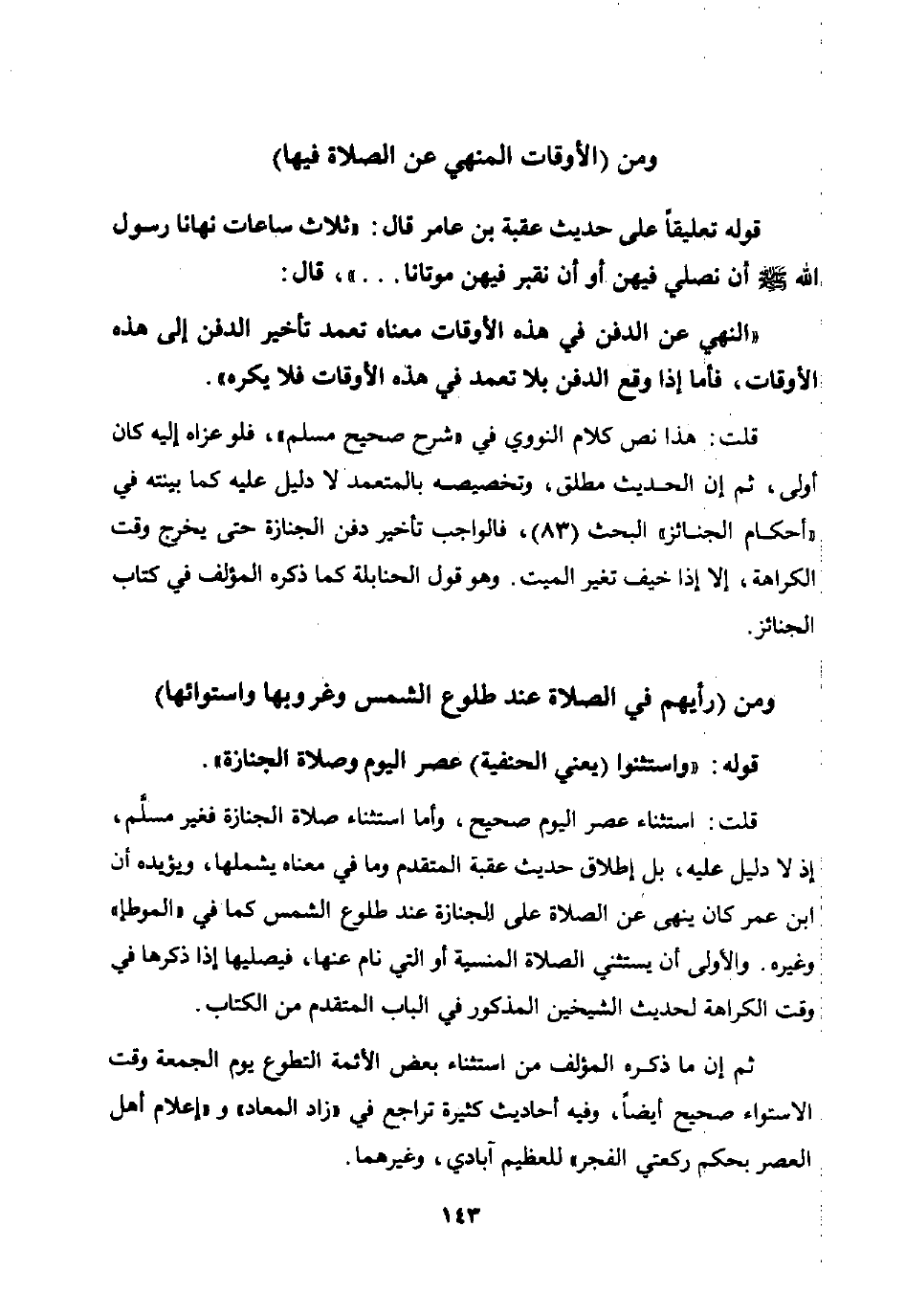 قلت: استثناء عصر اليوم صحيح وأما استثناء صلاة الجنازة فغير مسلم إذ لا دليل عليه بل إطلاق حديث عقبة المتقدم وما في معناه يشملها ويؤيده أن ابن عمر كان ينهى عن الصلاة على الجنازة عند طلوع الشمس كما في "الموطأ" وغيره والأولى أن يستثني الصلاة المنسية أو التي نام عنها فيصليها إذا ذكرها في وقت الكراهة لحديث الشيخين المذكور في الباب المتقدم من الكتاب.