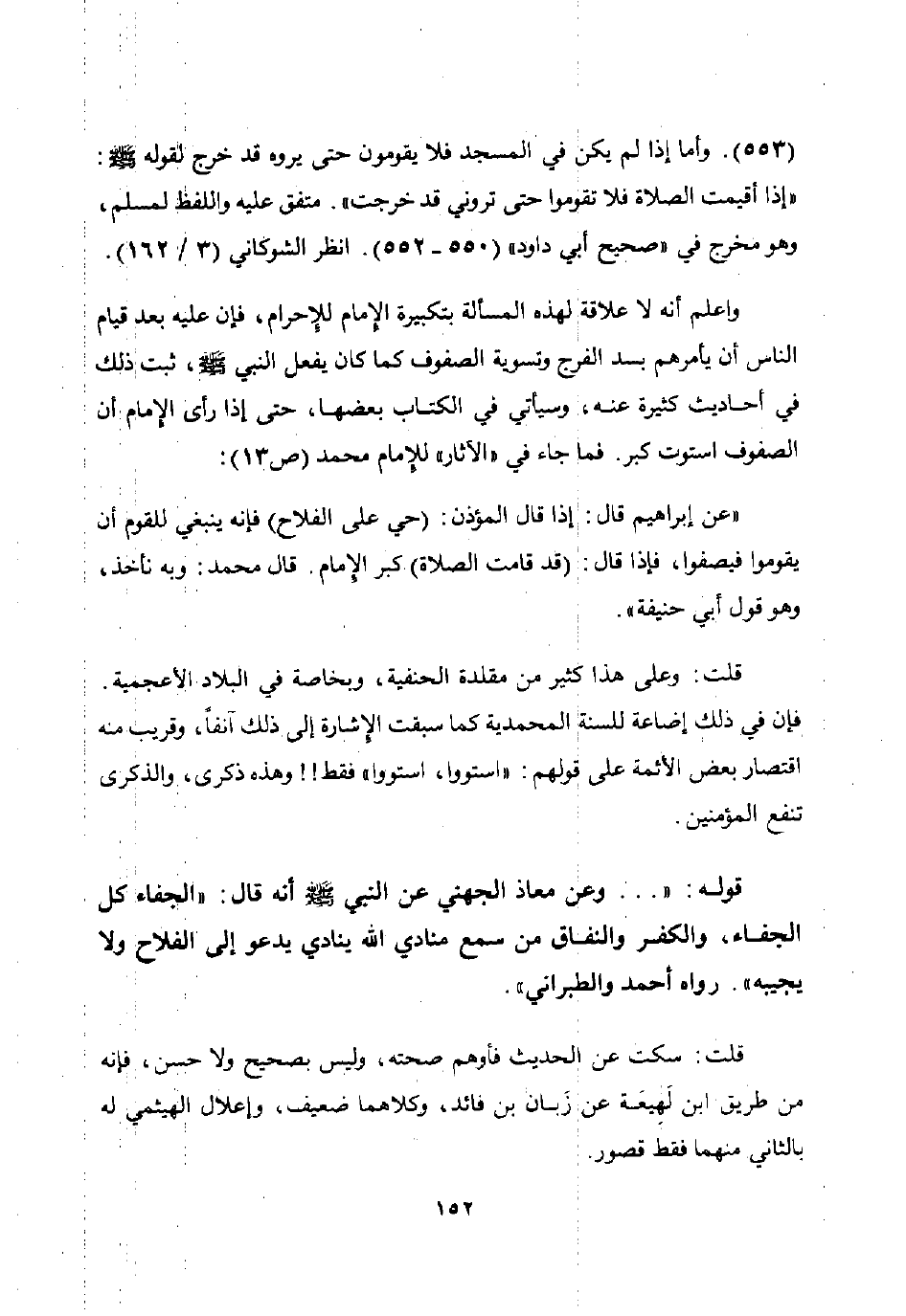 واعلم أنه لا علاقة لهذه المسألة بتكبيرة الإمام للإحرام فإن عليه بعد قيام الناس أن يأمرهم بسد الفرج وتسوية الصفوف كما كان يفعل النبي صلى الله عليه وسلم ثبت ذلك في أحاديث كثيرة عنه وسيأتي في الكتاب بعضها حتى إذا رأى الإمام أن الصفوف استوت كبر فما جاء في "الآثار" للإمام محمد ص 13: "عن إبراهيم قال: إذا قال المؤذن: حي على الفلاح فإنه ينبغي للقوم أن يقوموا فيصفوا فإذا قال: قد قامت الصلاة كبر الإمام. قال محمد: وبه نأخذ وهو قول أبي حنيفة".