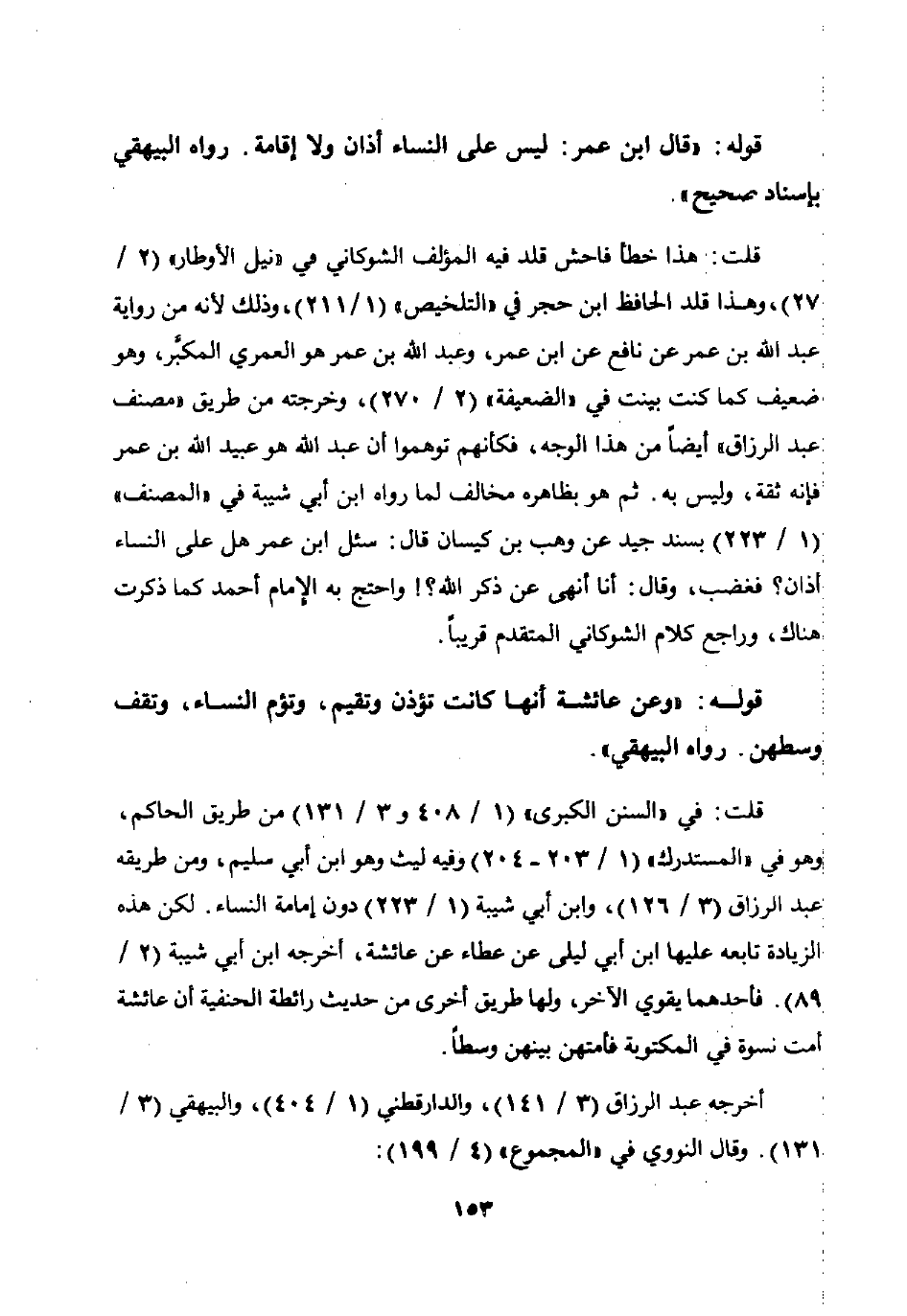 قلت: هذا خطأ فاحش قلد فيه المؤلف الشوكاني في "نيل الأوطار" 2 / 27 وهذا قلد الحافظ ابن حجر في "التلخيص" 1 / 211 وذلك لأنه من رواية عبد الله بن عمر عن نافع عن ابن عمر وعبد الله بن عمر هو العمري المكبر وهو ضعيف كما كنت بينت في "الضعيفة" 2 / 270 وخرجته من طريق "مصنف عبد الرزاق" أيضا من هذا الوجه فكأنهم توهموا أن عبد الله هو عبيد الله بن عمر فإنه ثقة وليس به. ثم هو بظاهره مخالف لما رواه ابن أبى شيبة في "المصنف" 1 / 223 بسند جيد عن وهب بن كيسان قال: سئل ابن عمر هل على النساء أذان؟ فغضب وقال: أنا أنهى عن ذكر الله؟! واحتج به الإمام أحمد كما ذكرت هناك وراجع كلام الشوكاني المتقدم قريبا.