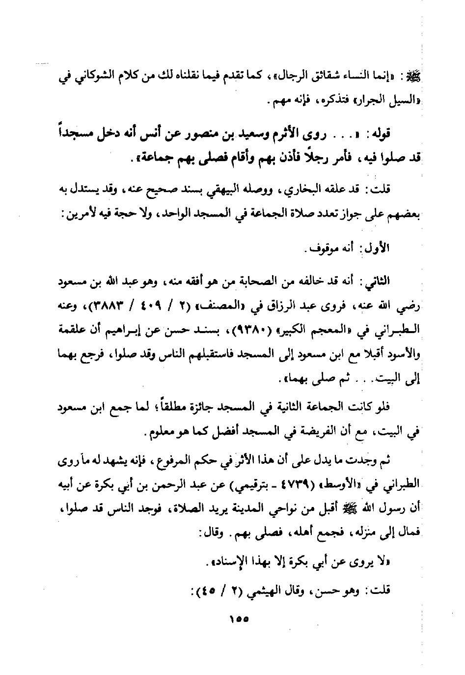 الثاني: أنه قد خالفه من الصحابة من هو أفقه منه وهو عبد الله بن مسعود رضي الله عنه فروى عبد الرزاق في "المصنف" 2 / 409 / 3883 وعنه الطبراني في "المعجم الكبير" 9380 بسند حسن عن إبراهيم أن علقمة والأسود أقبلا مع ابن مسعود إلى المسجد فاستقبلهم الناس وقد صلوا فرجع بهما إلى البيت ... ثم صلى بهما.