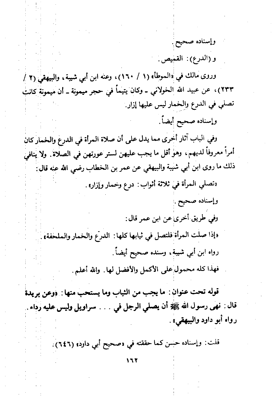 وفي الباب آثار أخرى مما يدل على أن صلاة المرأة في الدرع والخمار كان أمرا معروفا لديهم وهو أقل ما يجب عليهن لستر عورتهن في الصلاة ولا ينافي ذلك ما روى ابن أبي شيبة والبيهقي عن عمر بن الخطاب رضي الله عنه قال: "تصلي المرأة في ثلاثة أثواب: درع وخمار وإزار".