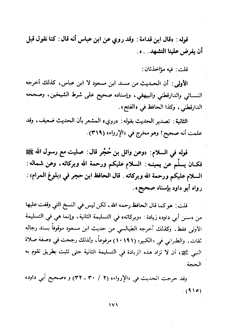 قوله في السلام: "وعن وائل بن حجر قال: صليت مع رسول الله صلى الله عليه وسلم فكان يسلم عن يمينه: "السلام عليكم ورحمة الله وبركاته" وعن شماله: "السلام عليكم ورحمة الله وبركاته". قال الحافظ ابن حجر في "بلوغ المرام": رواه أبو داود بإسناد صحيح".