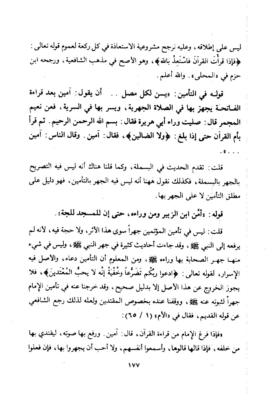 قلت: ليس في تأمين المؤتمين جهرا سوى هذا الأثر ولا حجة فيه لأنه لم يرفعه إلى النبي صلى الله عليه وسلم وقد جاءت أحاديث كثيرة في جهر النبي صلى الله عليه وسلم وليس في شيء منها جهر الصحابة بها وراءه صلى الله عليه وسلم ومن المعلوم أن التأمين دعاء والأصل فيه الإسرار لقوله تعالى: {ادْعُوا رَبَّكُمْ تَضَرُّعاً وَخُفْيَةً إِنَّهُ لا يُحِبُّ الْمُعْتَدِينَ} فلا يجوز الخروج عن هذا الأصل الا بدليل صحيح وقد خرجنا عنه في تأمين الإمام جهرا لثبوته عنه صلى الله عليه وسلم ووقفنا عنده بخصوص المقتدين ولعله لذلك رجع الشافعي عن قوله القديم فقال في "الأم" 1 / 65: