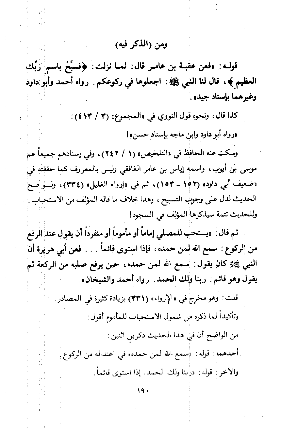ثم قال: "يستحب للمصلي إماما أو مأموما أو منفردا أن يقول عند الرفع من الركوع: سمع الله لمن حمده فإذا استوى قائما ... فعن أبي هريرة أن النبي صلى الله عليه وسلم كان يقول: "سمع الله لمن حمده" حين يرفع صلبه من الركعة ثم يقول وهو قائم: "ربنا ولك الحمد". رواه أحمد والشيخان".