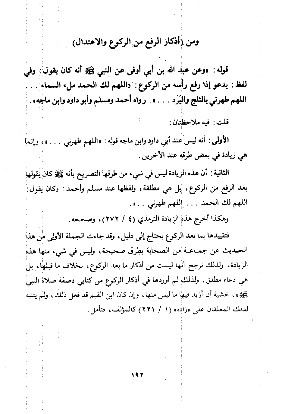 فتقييدها بما بعد الركوع يحتاج إلى دليل وقد جاءت الجملة الأولى من هذا الحديث عن جماعة من الصحابة بطرق صحيحة وليس في شيء منها هذه الزيادة ولذلك نرجح أنها ليست من أذكار ما بعد الركوع بخلاف ما قبلها بل هي دعاء مطلق ولذلك لم أوردها في أذكار الركوع من كتابي "صفة صلاة النبي صلى الله عليه وسلم" خشية أن أزيد فيها ما ليس منها وإن كان ابن القيم قد فعل ذلك ولم يتنبه لذلك المعلقان على "زاده" 1 / 221 كالمؤلف فتأمل.