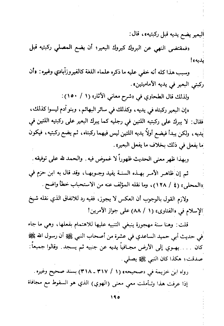 "إن البعير ركبتاه في يديه وكذلك في سائر البهائم وبنو آدم ليسوا كذلك فقال: لا يبرك على ركبتيه اللتين في رجليه كما يبرك البعير على ركبتيه اللتين في يديه ولكن يبدأ فيضع أولا يديه اللتين ليس فيهما ركبتاه ثم يضع ركبتيه فيكون ما يفعل في ذلك بخلاف ما يفعل البعير".