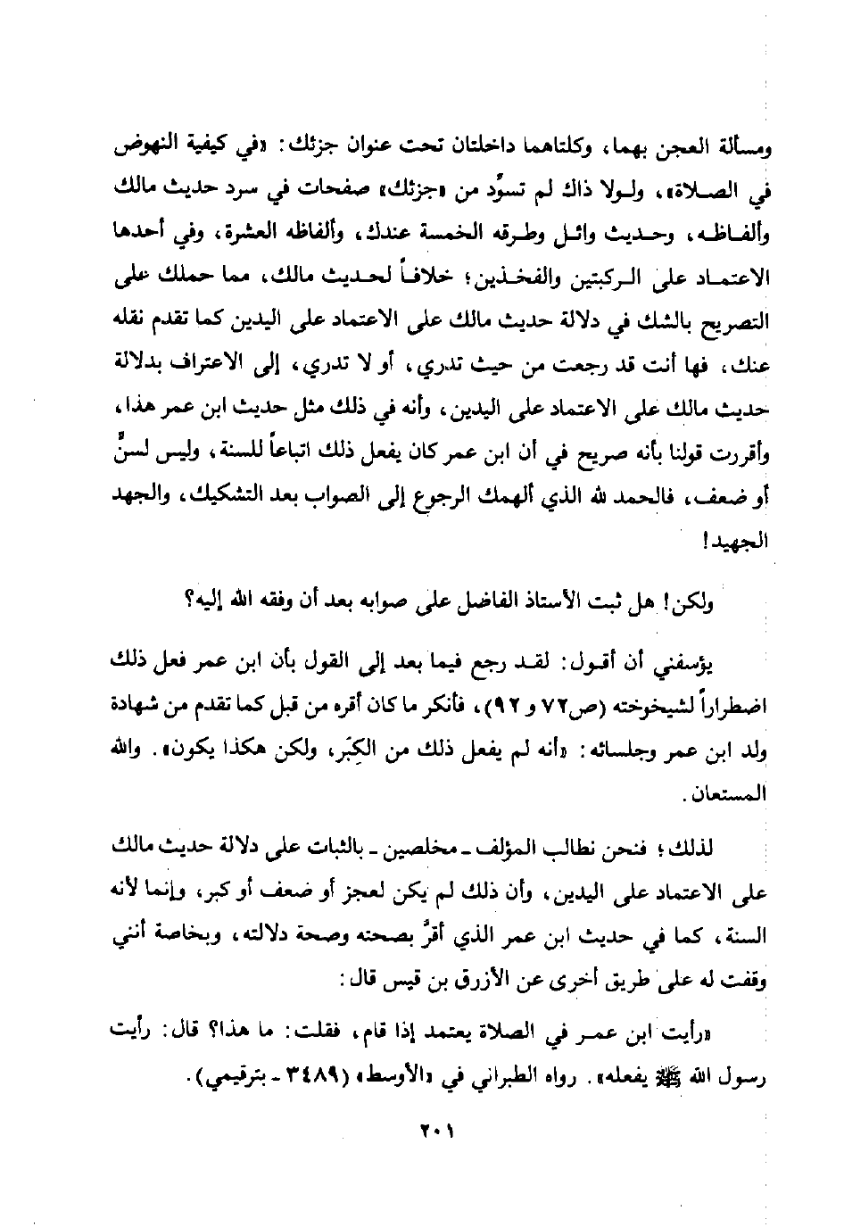 ومسألة العجن بهما وكلتاهما داخلتان تحت عنوان جزئك: "في كيفية النهوض في الصلاة" ولولا ذاك لم تسود من "جزئك لما صفحات في سرد حديث مالك وألفاظه وحديث وائل وطرقه الخمسة عندك وألفاظه العشرة وفي أحدها الاعتماد على الركبتين والفخذين خلافا لحديث مالك مما حملك على التصريح بالشك في دلالة حديث مالك على الاعتماد على اليدين كما تقدم نقله عنك فها أنت قد رجعت من حيث تدري أو لا تدري إلى الاعتراف بدلالة حديث مالك على الاعتماد على اليدين وأنه في ذلك مثل حديث ابن عمر هذا وأقررت قولنا بأنه صريح في أن ابن عمر كان يفعل ذلك اتباعا للسنة وليس لسن أو ضعف فالحمد لله الذي ألهمك الرجوع إلى الصواب بعد التشكيك والجهد الجهيد!