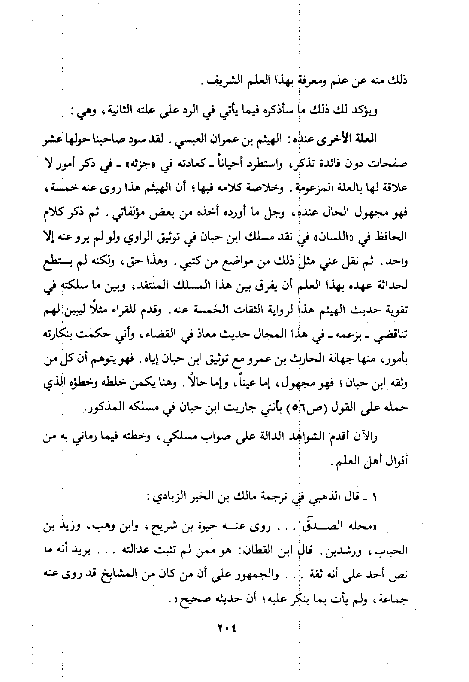 ثم نقل عني مثل ذلك من مواضع من كتبي. وهذا حق ولكنه لم يستطع لحداثة عهده بهذا العلم أن يفرق بين هذا المسلك المنتقد وبين ما سلكته في تقوية حديث الهيثم هذا لرواية الثقات الخمسة عنه. وقدم للقراء مثلا ليبين لهم تناقضي - بزعمه - في هذا المجال حديث معاذ في القضاء وأني حكمت بنكارته بأمور منها جهالة الحارث بن عمرو مع توثيق ابن حبان إياه. فهو يتوهم أن كل من وثقه ابن حبان فهو مجهول إما عينا وإما حالا. وهنا يكمن خلطه وخطؤه الذي حمله على القول ص 56 بأنني جاريت ابن حبان في مسلكه المذكور.