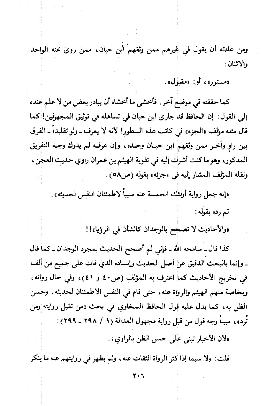 كما حققته في موضع آخر. فأخشى ما أخشاه أن يبادر بعض من لا علم عنده إلى القول: إن الحافظ قد جارى ابن حبان في تساهله في توثيق المجهولين كما قال مثله مؤلف "الجزء في كاتب هذه السطور" لأنه لا يعرف - ولو تقليدا - الفرق بين راو وآخر ممن وثقهم ابن حبان وحده إن عرفه لم يدرك وجه التفريق المذكور وهو ما كنت أشرت إليه في تقوية الهيثم بن عمران راوي حديث العجن ونقله المؤلف المشار إليه في "جزئه" بقوله ص 58.