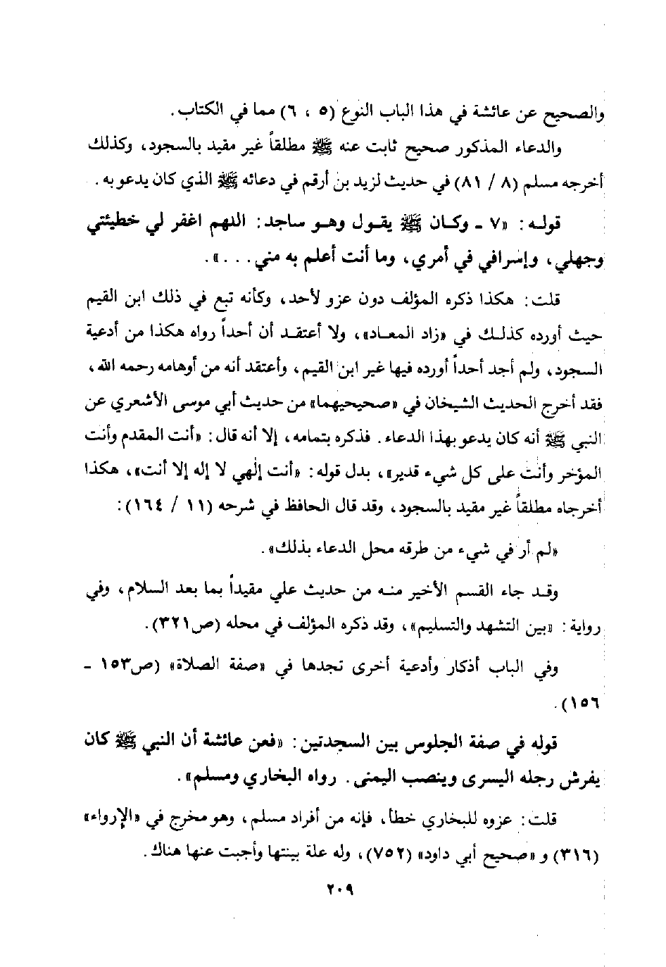 قلت: هكذا ذكره المؤلف دون عزو لأحد وكأنه تبع في ذلك ابن القيم حيث أورده كذلك في "زاد المعاد" ولا أعتقد أن أحدا رواه هكذا من أدعية السجود ولم أجد أحدا أورده فيها غير ابن القيم وأعتقد أنه من أوهامه رحمه الله فقد أخرج الحديث الشيخان في "صحيحيهما" من حديث أبي موسى الاشعري عن النبي صلى الله عليه وسلم أنه كان يدعو بهذا الدعاء. فذكره بتمامه إلا أنه قال: "أنت المقدم وأنت المؤخر وأنت على كل شيء قدير" بدل قوله: "أنت إلهي لا إله إلا أنت" هكذا أخرجاه مطلقا غير مقيد بالسجود وقد قال الحافظ في شرحه 11 / 164: