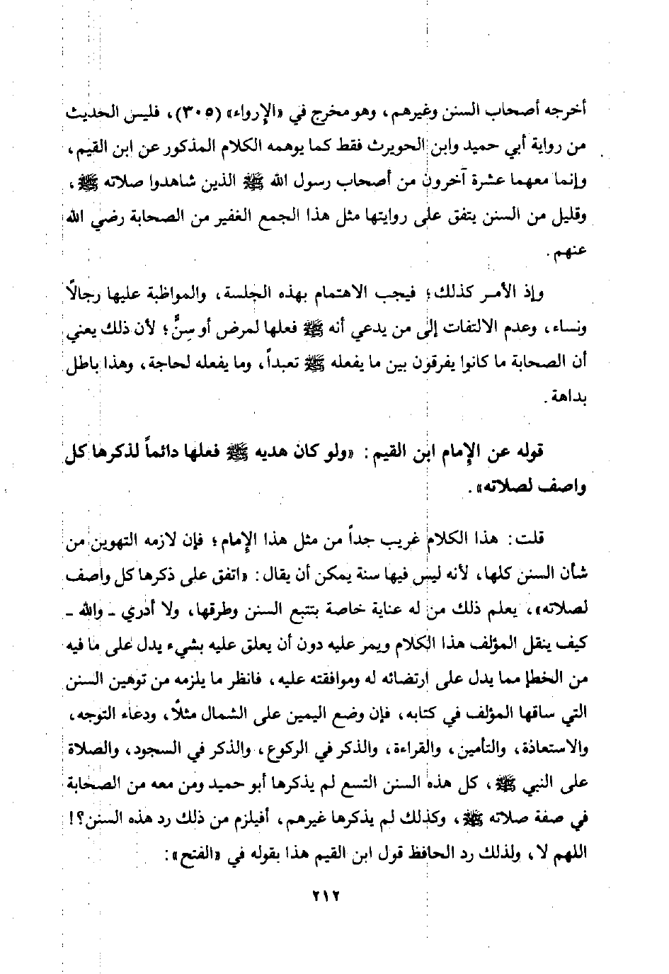 قلت: هذا الكلام غريب جدا من مثل هذا الإمام فإن لازمه التهوين من شأن السنن كلها لأنه ليس فيها سنة يمكن أن يقال: "اتفق على ذكرها كل واصف لصلاته" يعلم ذلك من له عناية خاصة بتتبع السنن وطرقها ولا أدري - والله - كيف ينقل المؤلف هذا الكلام ويمر عليه دون أن يعلق عليه بشيء يدل على ما فيه من الخطأ مما يدل على ارتضائه له وموافقته عليه فانظر ما يلزمه من توهين السنن التي ساقها المؤلف في كتابه فإن وضع اليمين على الشمال مثلا ودعاء التوجه والاستعاذة والتأمين والقراءة والذكر في الركوع والذكر في السجود والصلاة على النبي صلى الله عليه وسلم كل هذه السنن التسع لم يذكرها أبو حميد ومن معه من الصحابة في صفة صلاته صلى الله عليه وسلم وكذلك لم يذكرها غيرهم أفيلزم من ذلك رد هذه السنن؟ اللهم لا ولذلك رد الحافظ قول ابن القيم هذا بقوله في "الفتح ":