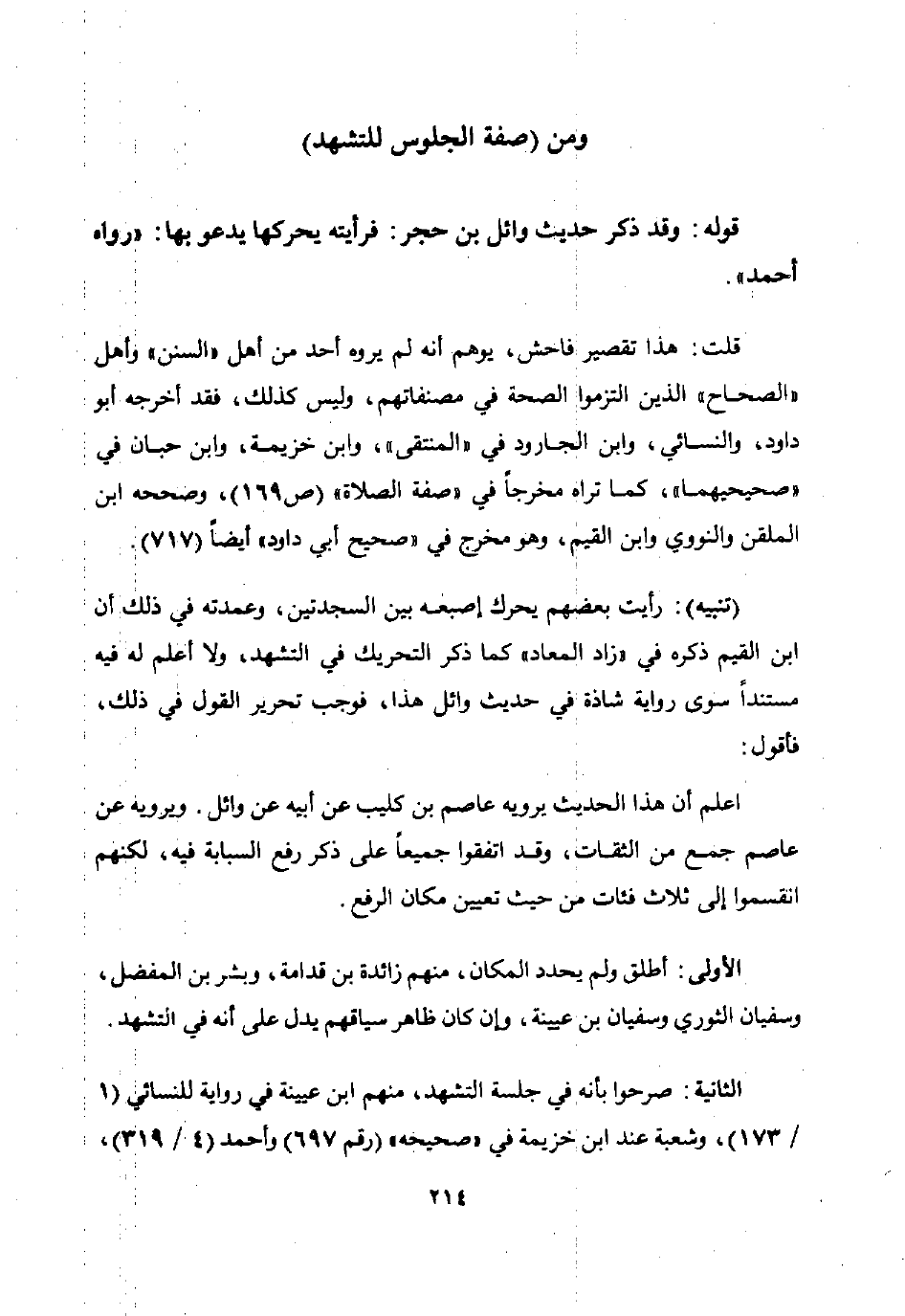 قلت: هذا تقصير فاحش يوهم أنه لم يروه أحد من أهل "السنن" وأهل "الصحاح" الذين التزموا الصحة في مصنفاتهم وليس كذلك فقد أخرجه أبو داود والنسائي وابن الجارود في "المنتقى" وابن خزيمة وابن حبان في "صحيحيهما" كما تراه مخرجا في "صفة الصلاة" ص 169 وصححه ابن الملقن والنووي وابن القيم وهو مخرج في "صحيح أبي داود" أيضا 717.