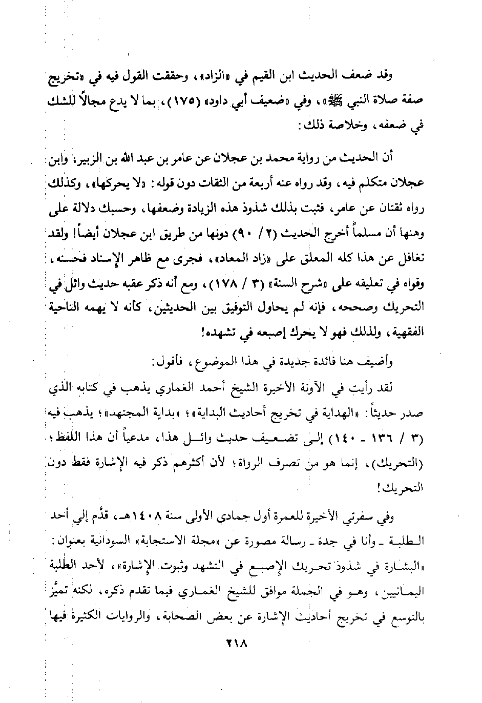 لقد رأيت في الآونة الأخيرة الشيخ أحمد الغماري يذهب في كتابه الذي صدر حديثا: "الهداية في تخريج أحاديث البداية "؛ "بداية المجتهد " يذهب فيه 3 / 136 - 140 إلى تضعيف حديث وائل هذا مدعيا أن هذا اللفظ التحريك. إنما هو من تصرف الرواة لأن أكثرهم ذكر فيه الإشارة فقط دون التحريك!