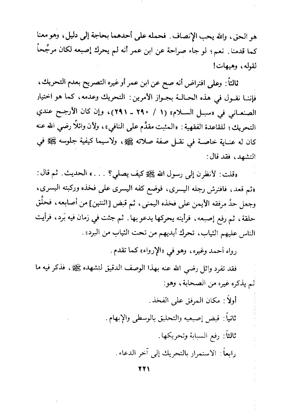 ثالثا: وعلى افتراض أنه صح عن ابن عمر أو غيره التصريح بعدم التحريك فإننا نقول في هذه الحالة بجواز الأمرين: التحريك وعدمه كما هو اختيار الصنعاني في "سبل السلام" 1 / 290 - 291 وإن كان الأرجح عندي التحريك للقاعدة الفقهية: "المثبت مقدم على النافي" ولأن وائلا رضي الله عنه كان له عناية خاصة في نقل صفة صلاته صلى الله عليه وسلم ولاسيما كيفية جلوسه صلى الله عليه وسلم في التشهد فقد قال: