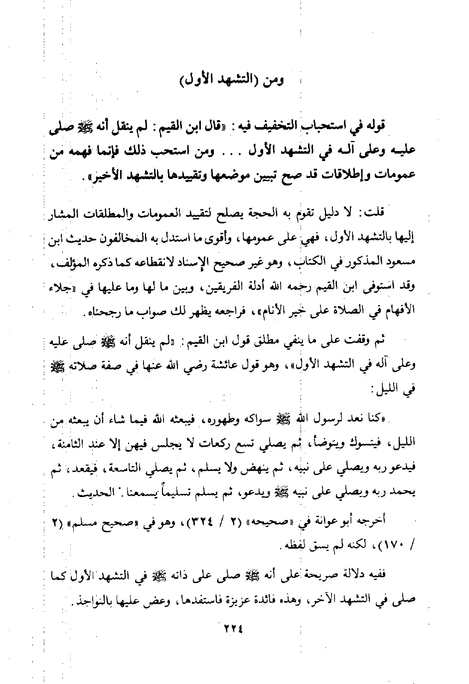 قوله في استحباب التخفيف فيه: "قال ابن القيم: لم ينقل أنه صلى الله عليه وسلم صلى عليه وعلى آله في التشهد الأول ... ومن استحب ذلك فإنما فهمه من عمومات وإطلاقات قد صح تبيين موضعها وتقييدها بالتشهد الأخير".