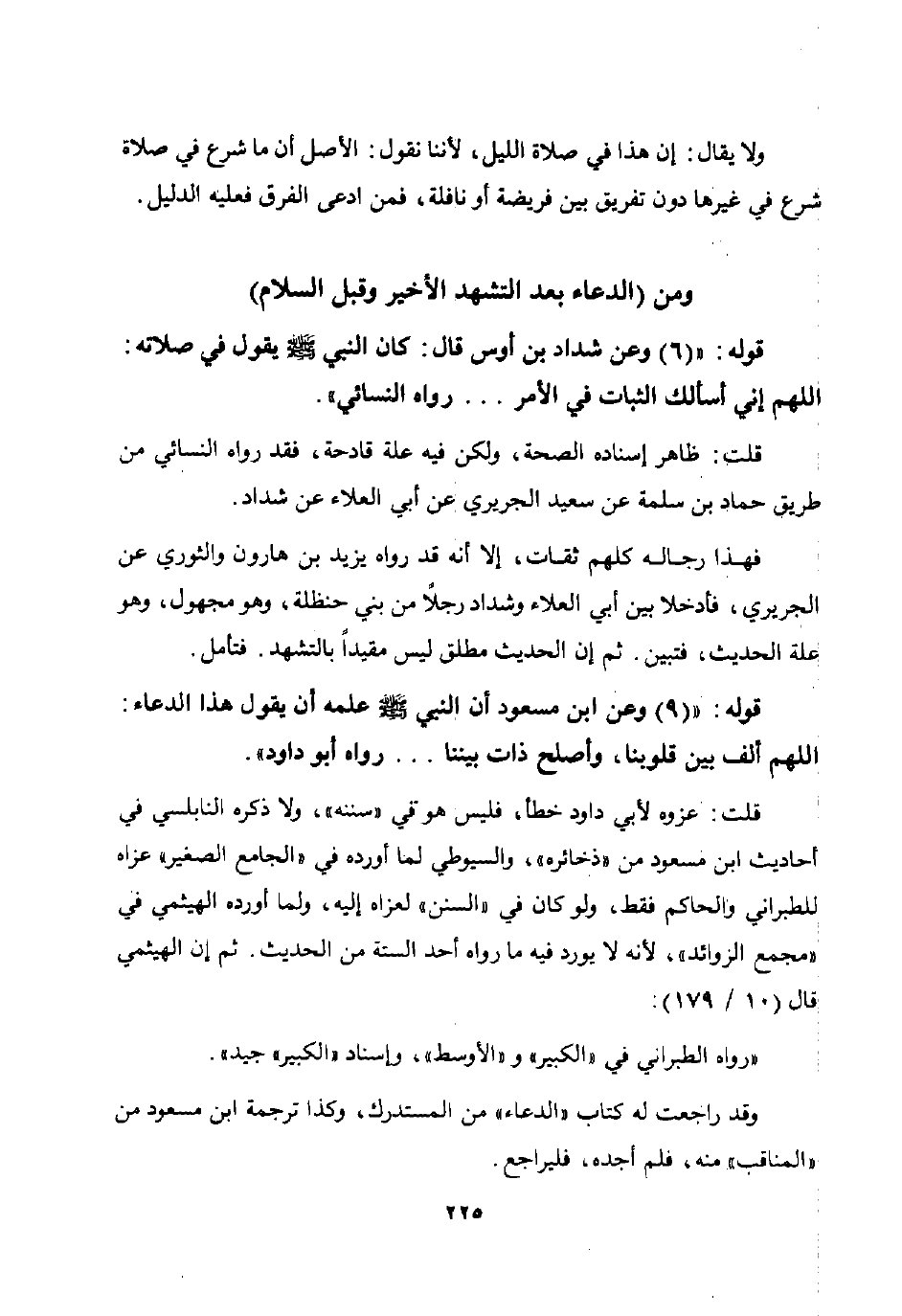 فهذا رجاله كلهم ثقات إلا أنه قد رواه يزيد بن هارون والثوري عن الجريري فأدخلا بين أبي العلاء وشداد رجلا من بني حنظلة وهو مجهول وهو علة الحديث فتبين. ثم إن الحديث مطلق ليس مقيدا بالتشهد