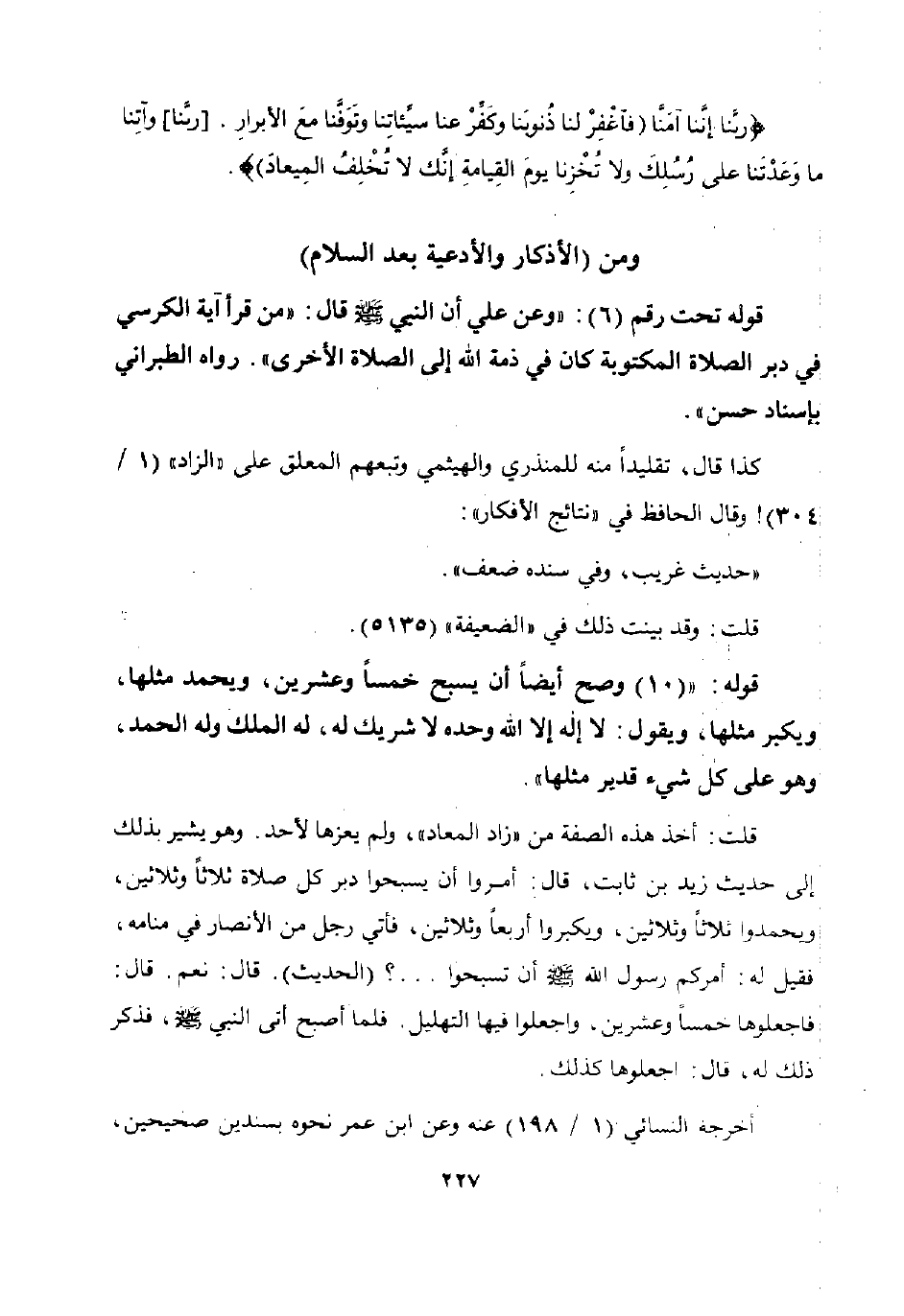 قوله تحت رقم 6: "وعن علي أن النبي صلى الله عليه وسلم قال: "من قرأ آية الكرسي في دبر الصلاة المكتوبة كان في ذمة الله إلى الصلاة الأخرى" رواه الطبراني بإسناد حسن".