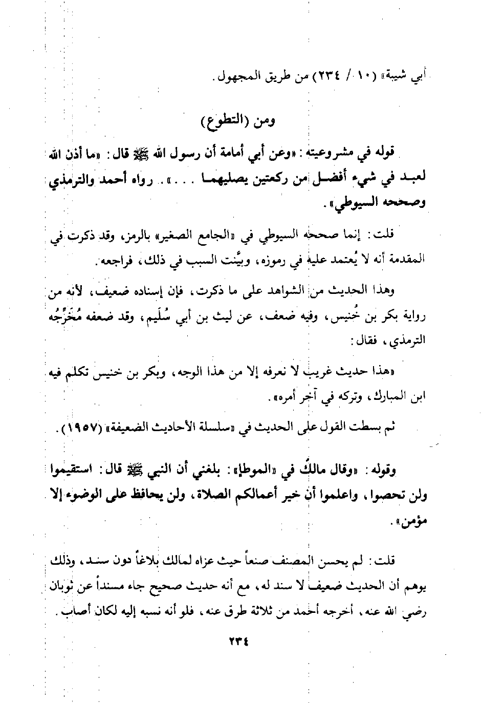 قوله في مشروعيته: "وعن أبي أمامة أن رسول الله صلى الله عليه وسلم قال: "ما أذن الله لعبد في شيء أفضل من ركعتين يصليهما ... ". رواه أحمد والترمذي وصححه السيوطي".