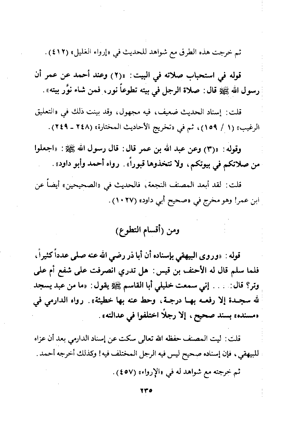 وقوله:" 3 وعن عبد الله بن عمر قال: قال رسول الله صلى الله عليه وسلم: "اجعلوا من صلاتكم في بيوتكم ولا تتخذوها قبورا" رواه أحمد وأبو داود".