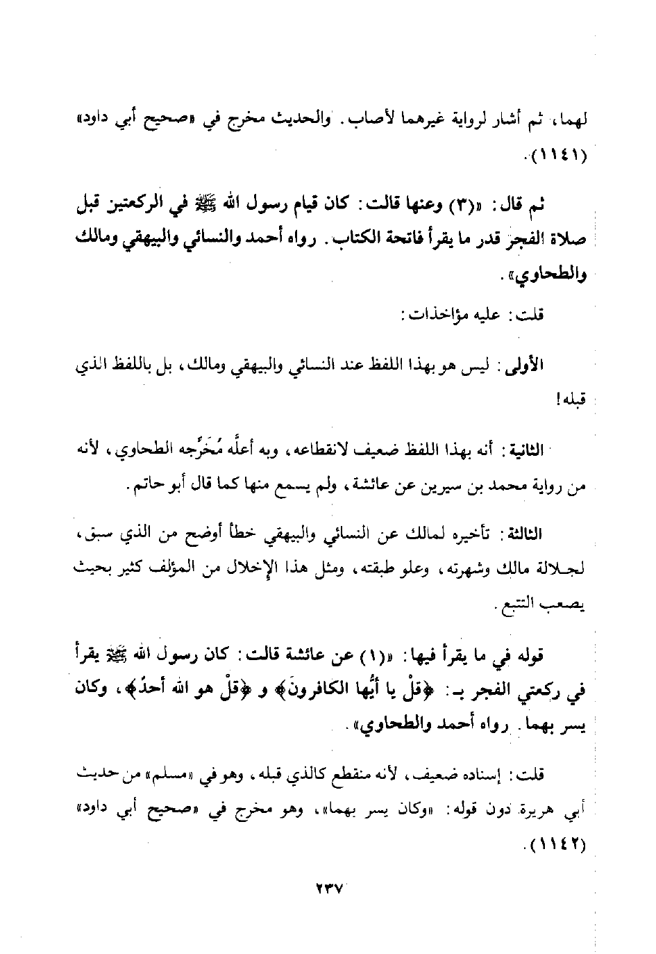 قوله في ما يقرأ فيها:" 1 عن عاثشة قالت: كان رسول الله صلى الله عليه وسلم يقرأ في ركعتي الفجر بـ: {قُلْ يَا أَيُّهَا الْكَافِرُونَ} و {قُلْ هُوَ اللَّهُ أَحَدٌ} وكان يسر بهما. رواه أحمد والطحاوي".