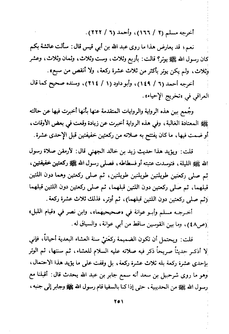 قلت: ويحتمل أن تكون الضميمة ركعتي سنة العشاء البعدية أحيانا فإني لا أذكر حديثا صريحا ذكر فيه صلاته عليه السلام للعشاء ثم سنتها ثم الوتر بإحدى عشرة ركعة بله ثلاث عشرة ركعة بل وقفت على ما يؤيد هذا الاحتمال وهو ما روى شرحبيل بن سعد أنه سمع جابر بن عبد الله يحدث قال: أقبلنا مع رسول الله صلى الله عليه وسلم من الحديبية حتى إذا كنا بالسقيا قام رسول الله صلى الله عليه وسلم وجابر إلى جنبه فصلى العتمة ثم صلى ثلاث عشرة سجدة. رواه ابن نصر ورجاله ثقات إلا أن شرحبيل بن سعد كان اختلط بآخره. والله أعلم.
