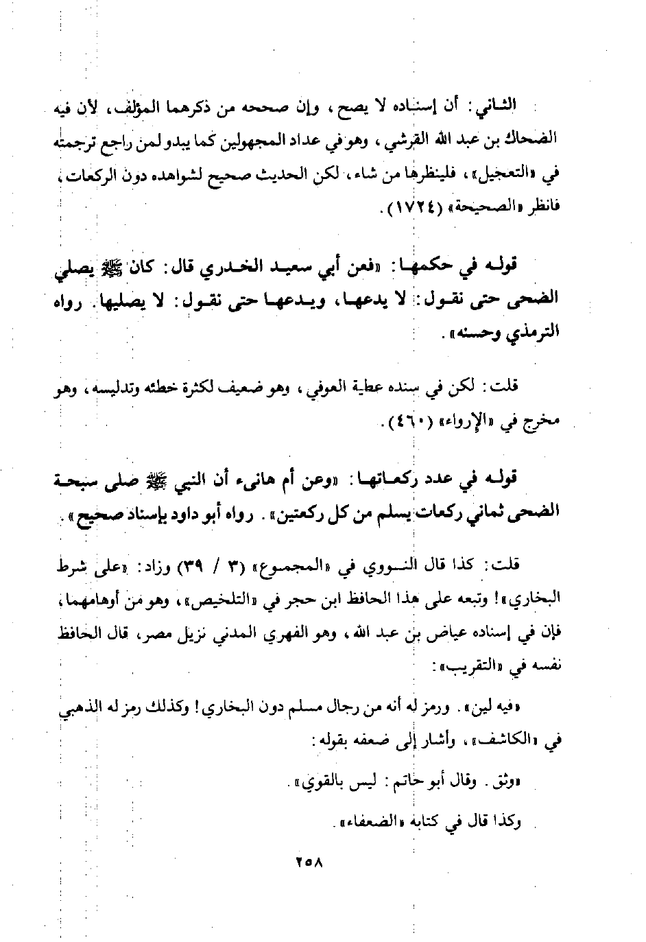 قوله في حكمها: "فعن أبي سعيد الخدري قال: كان صلى الله عليه وسلم يصلى الضحى حتى نقول: لا يدعها ويدعها حتى نقول: لا يصليها. رواه الترمذي وحسنه".